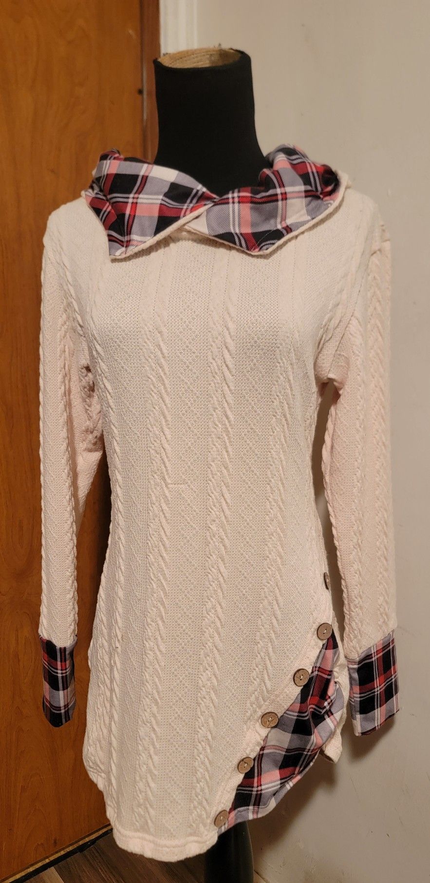 Women's Twisted Cable Knit Hooded Plaid Sweater Size Medium