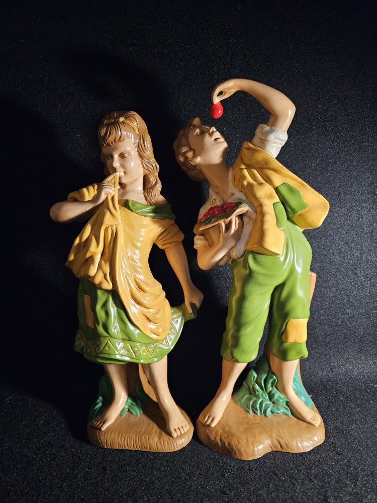 Rare Vintage hand painted Orfanello plaster figurine set from Atlantic Mold Company. Cir: late 60's early 70's of a peasant girl and boy picking cherries, The girl is 18" tall and boy is 19" tall, both are free of any damage, no chips breaks or nicks, very well painted ,great attention to detail. Offers are welcome. Estimated pricing for this condition est $150-$250 pair. Must pick up in Easley.