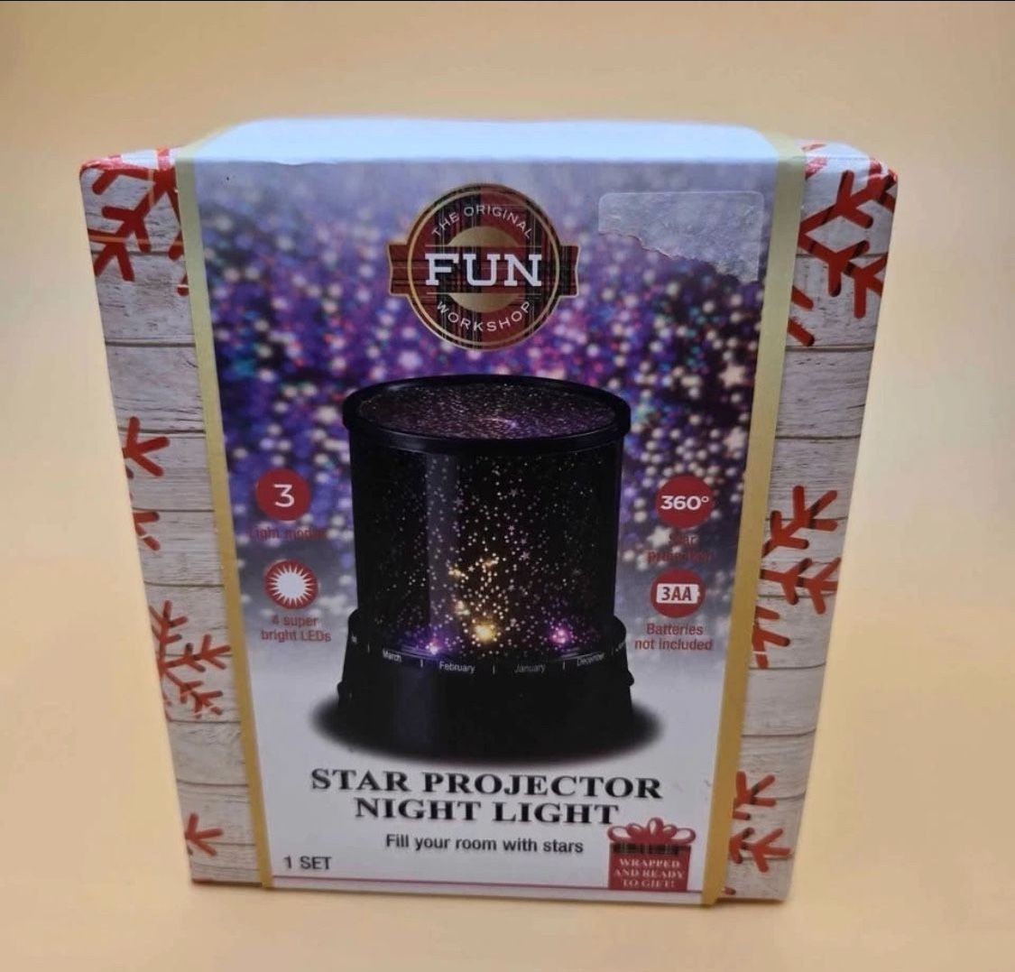 The Original Fun Workshop Star Projector Night Light Brand New $6 * Long-lasting LEDs * 3 light modes: solid white, color twinkle, and both white & color twinkle * Battery powered * 360° projection * Do not mix old and new batteries. * Do not mix alkaline, standard (carbon-zinc), or rechargeable batteries. * Requires 3 x 1.5V AA batteries (not included)