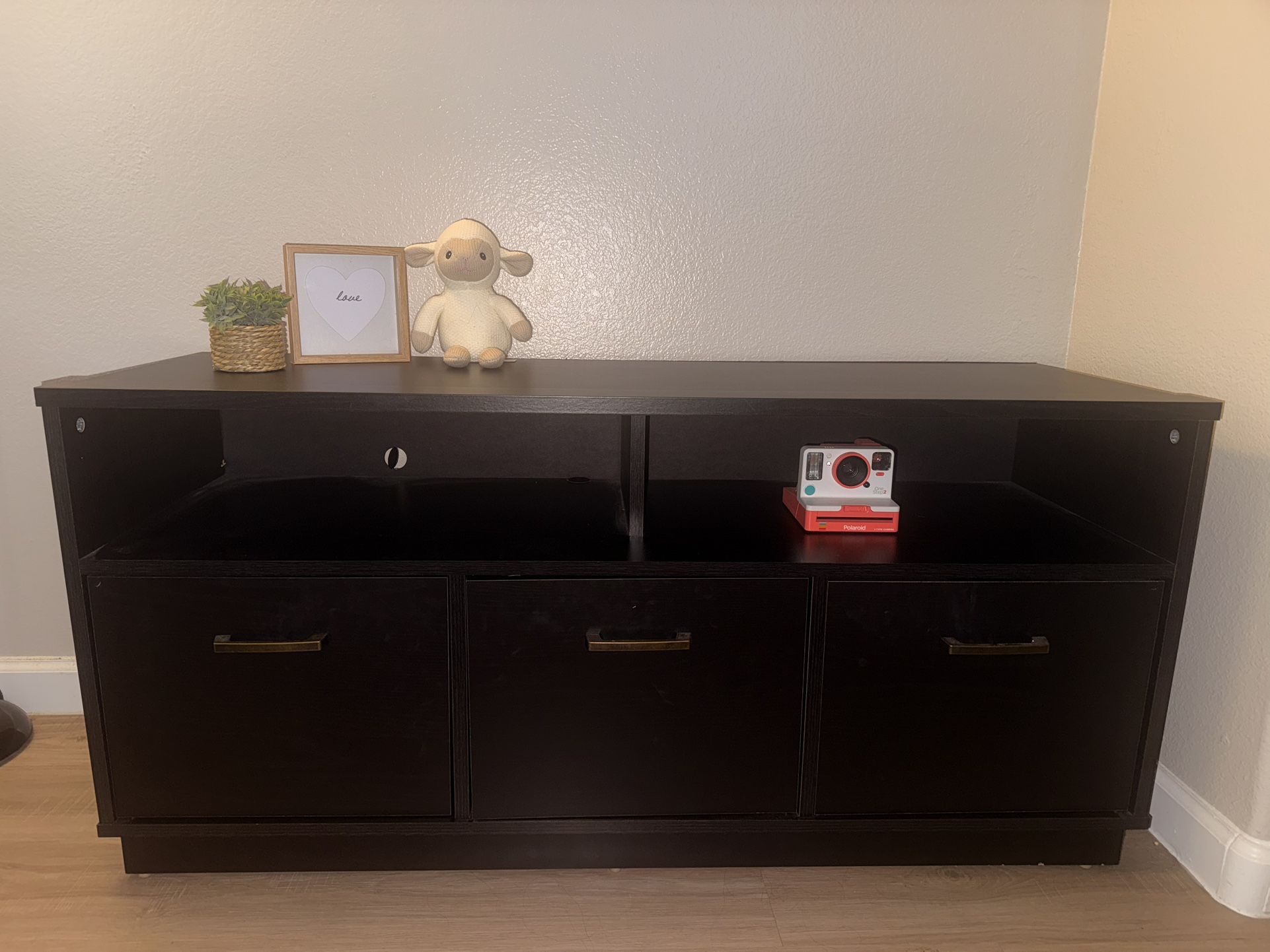 Simple 3 cabinet entertainment stand, held my 55in tv perfectly. Black. Barely used. No scrapes and really light to carry