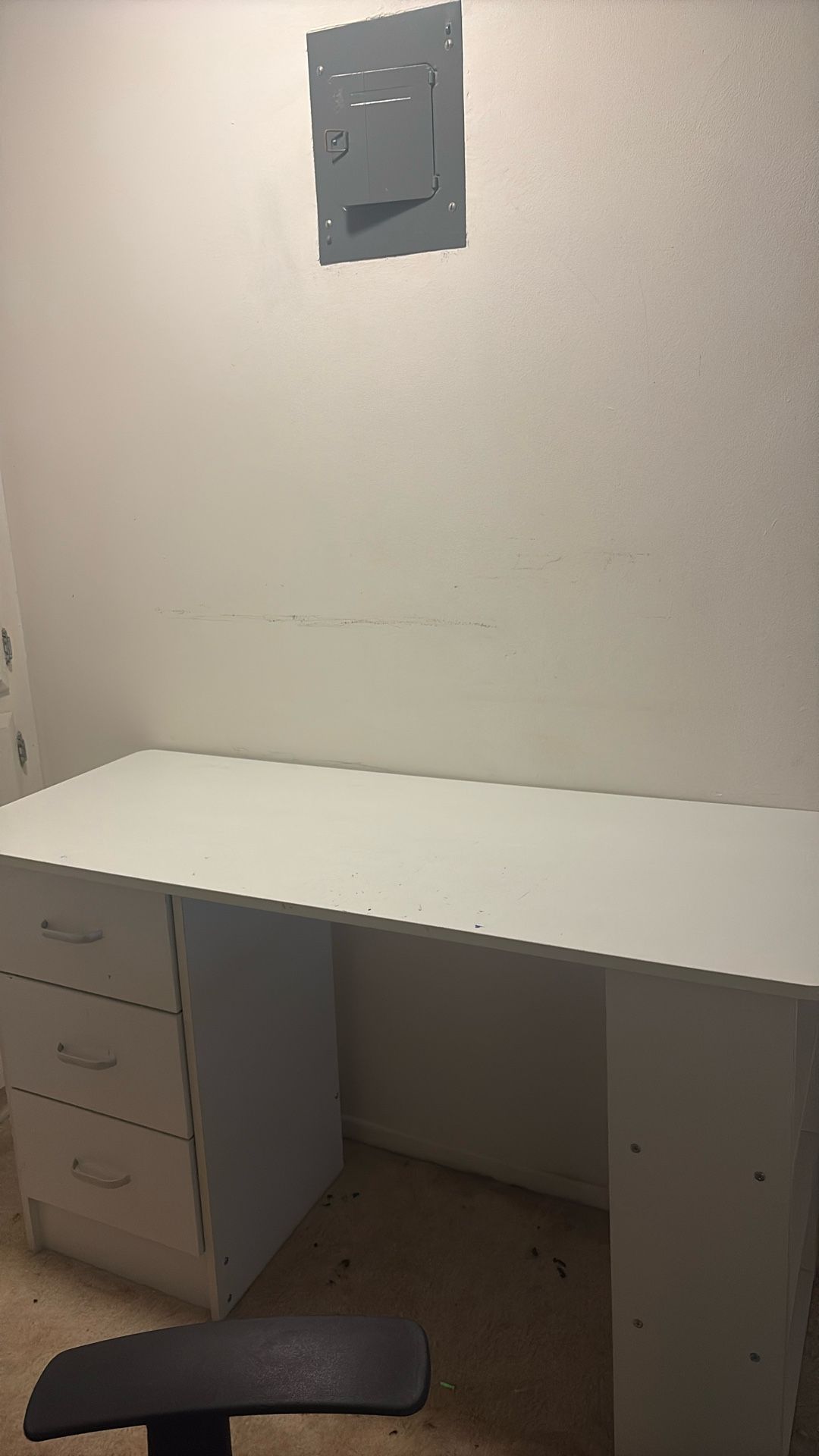 Used but in good shape Comes with a black chair Three drawers and three sides Chair has few stains but if needed will be cleaned