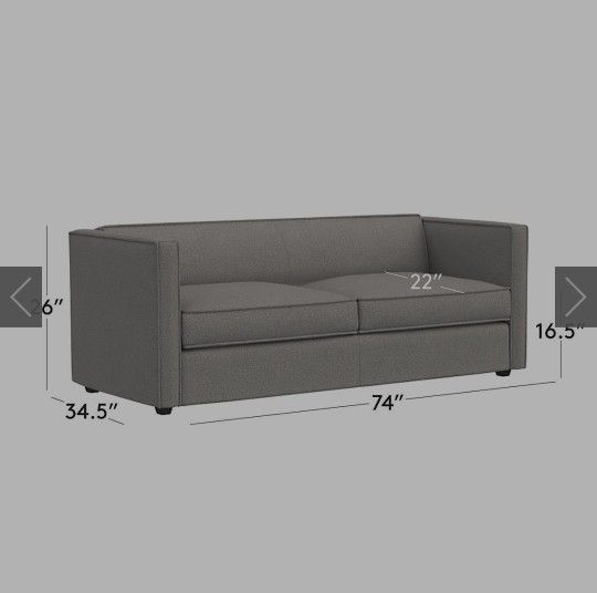 This CB2 large 2-seater sofa features a sleek, modern design with clean lines and a spacious, comfortable seat perfect for relaxing or entertaining. Upholstered in high-quality fabric with plush cushions, it adds a sophisticated touch to any living space while offering lasting durability and support. Overall Dimensions: Width: 74" Depth: 34.5" Height: 26" Seat Depth: 22" Height: 16.5"
