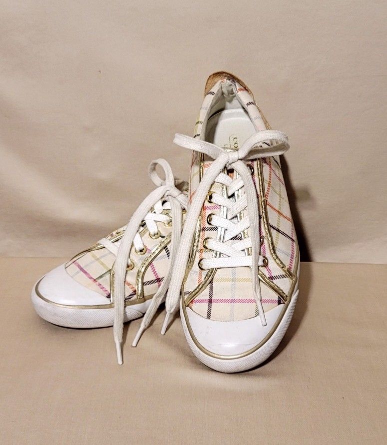 Women's Coach tennis shoes size: 7.5-8 Shoes are very slightly worn maybe two times... no blemishes or tears anything like that.. just didn't realize that my foot has grown and I wear a larger size now LOL