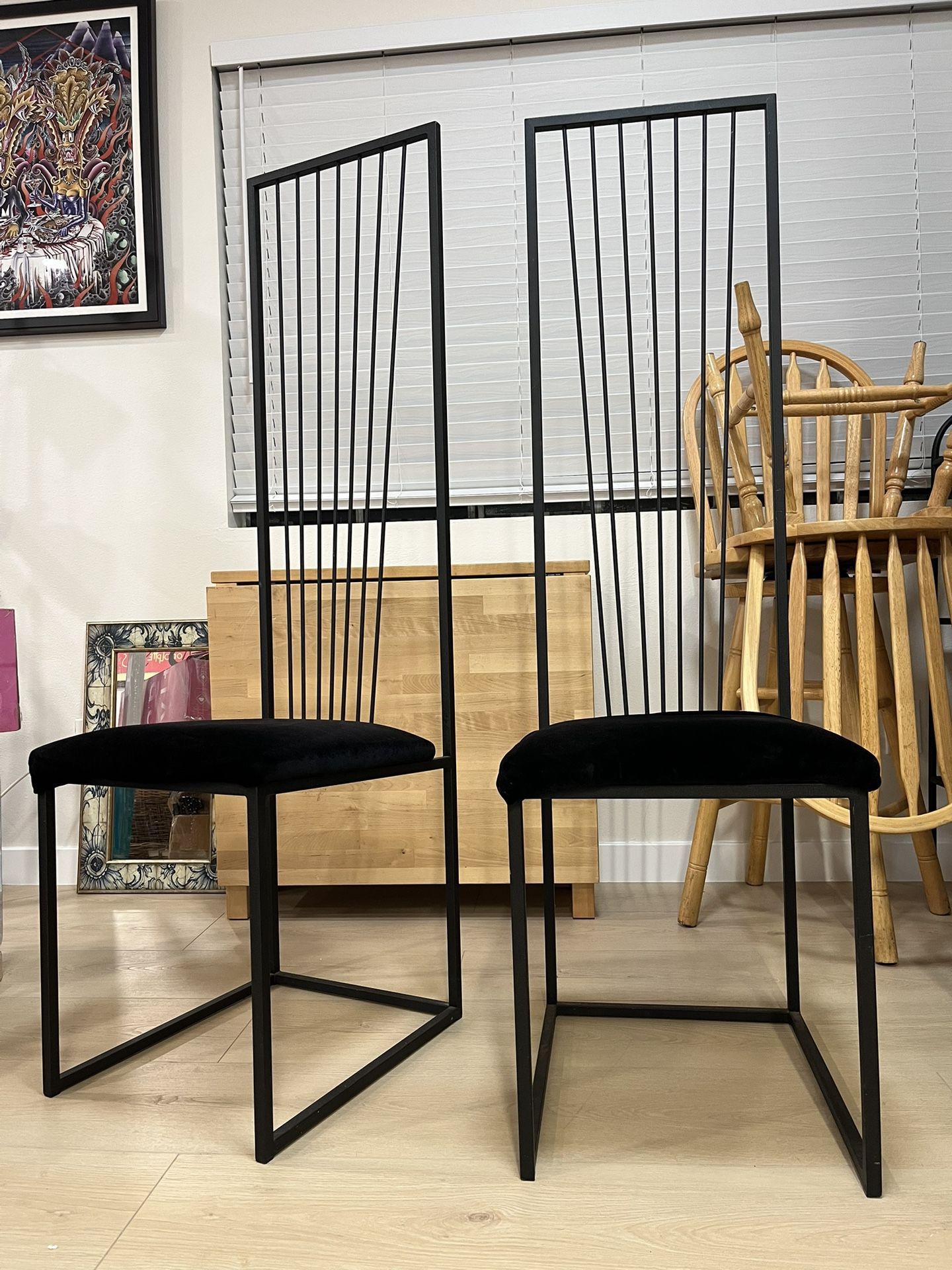 Pair of unique chairs with metal frames, cushion seats and flexible backs. Used with plenty of life left.