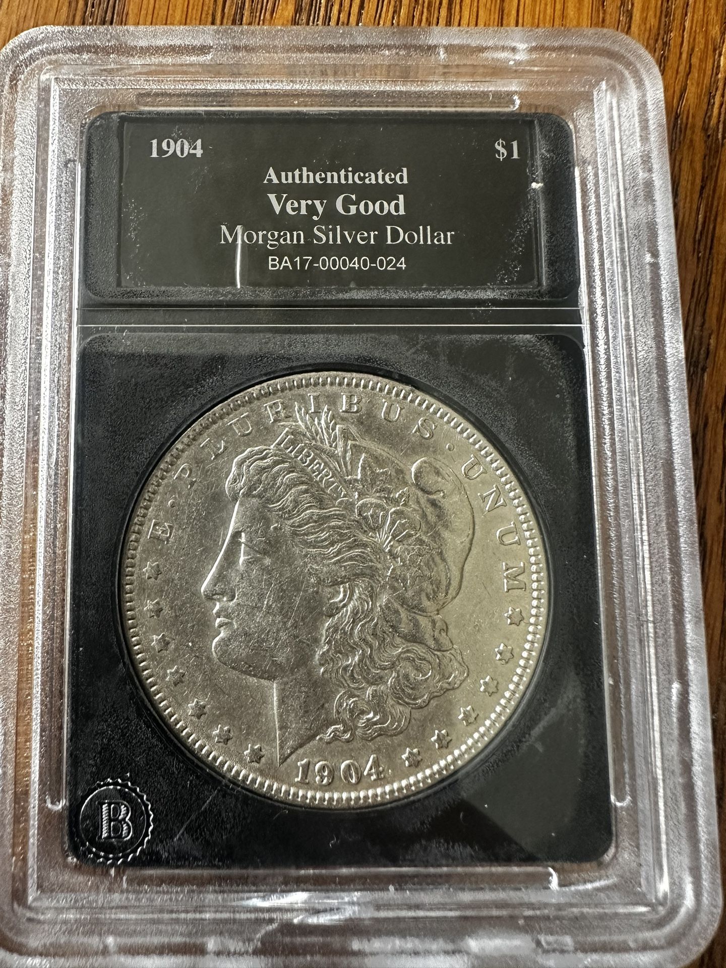 1904 Morgan Silver Dollar • Philadelphia Mint (no mint mark) • 90% silver • Authenticated: “Very Good (VG)” • Encapsulated in a third-party authentication