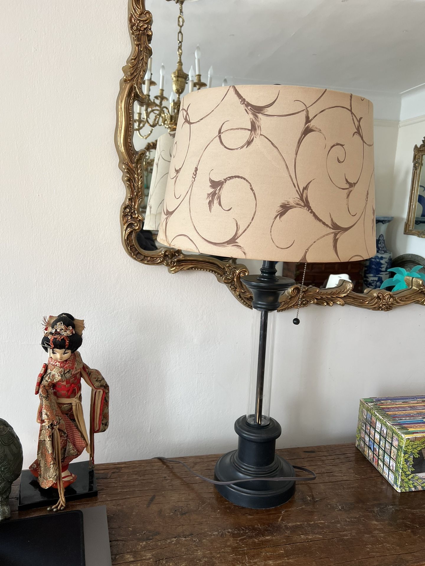 Charming table lamp with classic design and sleek glass base. Working lamp but pull switch needs to be fixed so i just unplug to turn off. Some discoloring on the shade. See photos! Approx 33 in tall 14 in lamp shade diameter