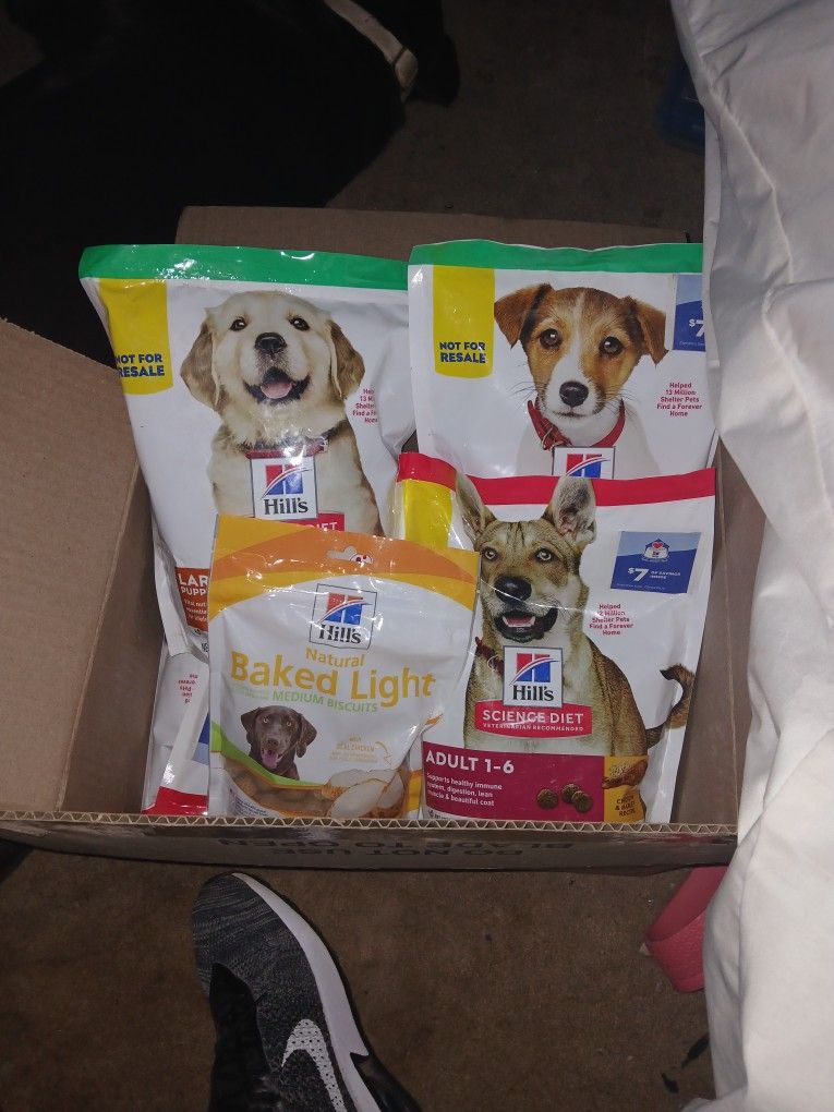 Hi I have tons of each kind of dog food seen in pic. Each bag is 2lb. of Hills Science Diet (not prescription). We have:: -Adult 1-6 Chicken and Barley ($8 ea or 2 for $15) -Puppy Small Bites Chicken and Brown Rice ($10 or 2 $18) -Puppy Lg Breed Chicken and Brown Rice ($8 or 2 for $15) Also have a few bags of Hills Baked Light treats ($7 ea) All bags are brand new, unopened. **Also have cat and kitten dry food upon request.