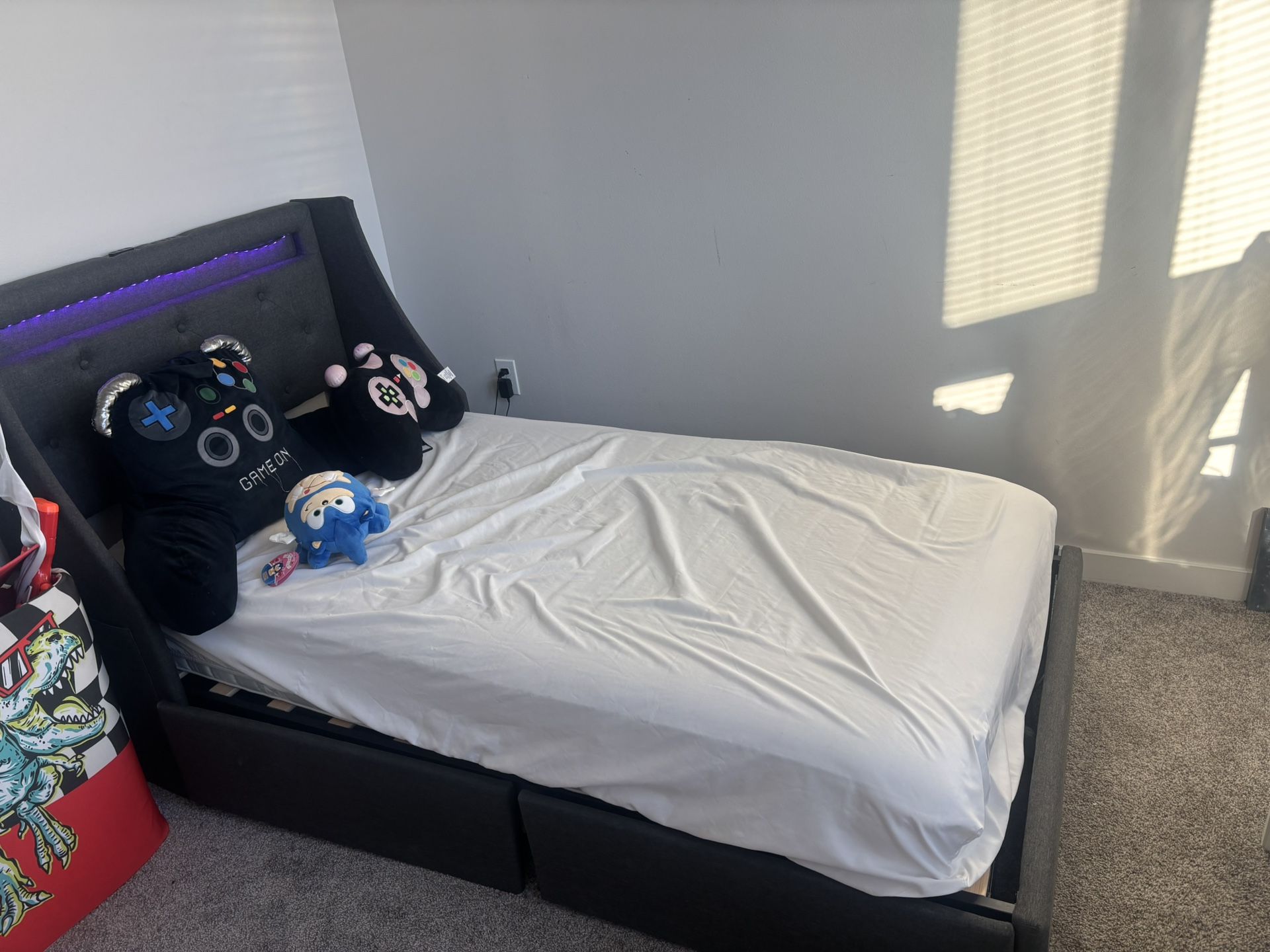 Selling a twin size bed frame. Sturdy and well kept. Mattress not included (may include upon request, but it does have some stains). Message me if interested!