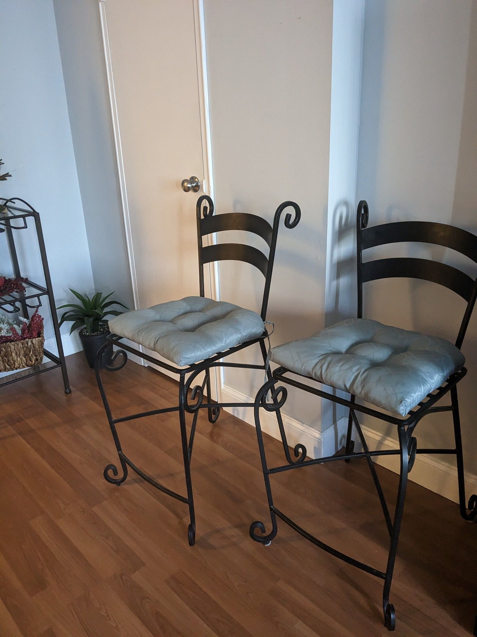 2 black wrought iron bar height chairs. Selling without cushions, great condition.