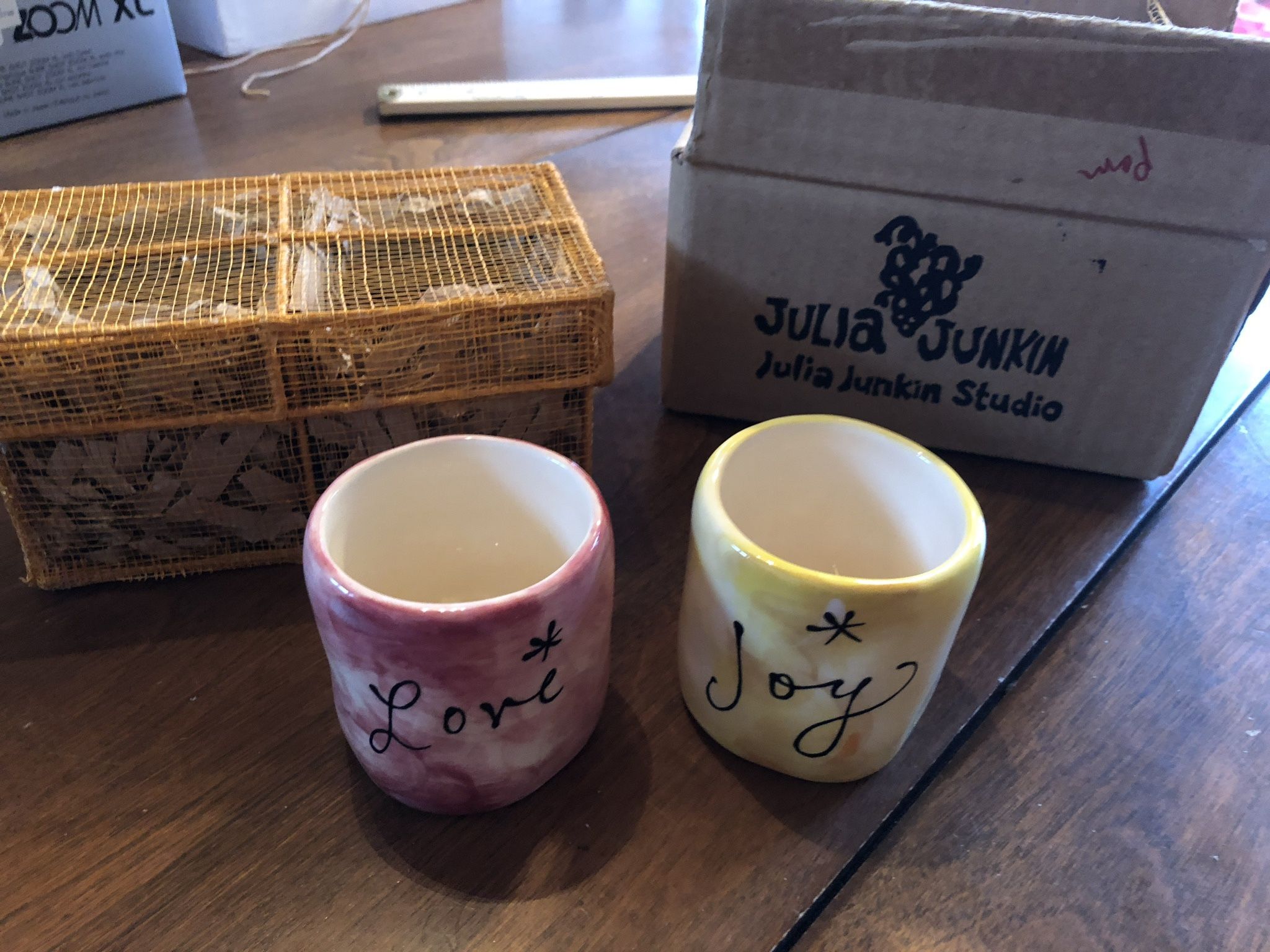 A perfect gift for a girlfriend or save for a birthday gift. This is a set of candleholders 2.5x2.5 one says Joy and the other Love. Handpainted. Comes in a great basket box with a ribbon. New never been opened.
