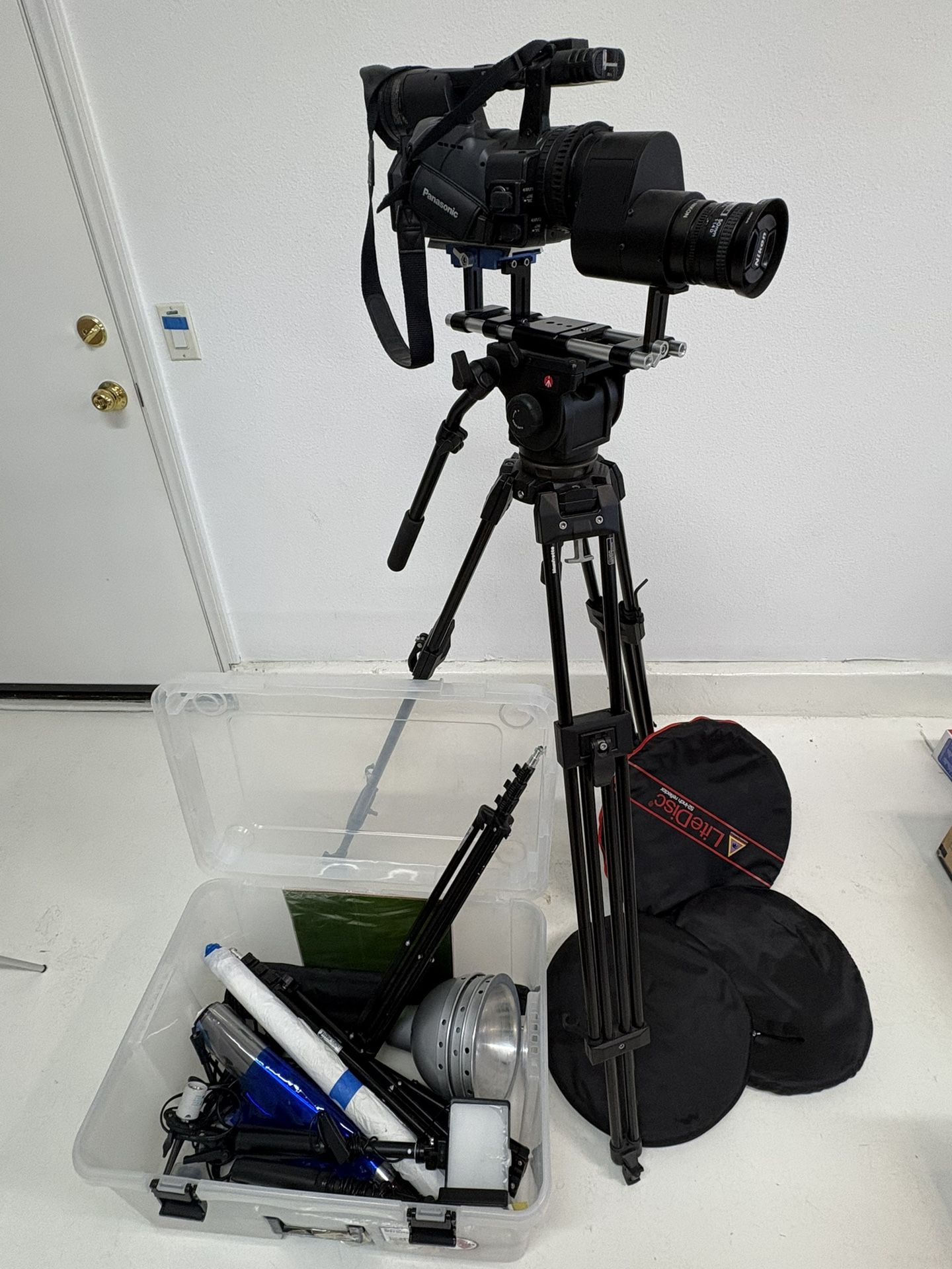 Tripod Manfrotto 350MVB Professional Video Tripod Legs (Black) with 100mm Half Ball and 516 Head. + 1080p camera with 30mm adapter, lights, tripods, gels, screens and more. CASH only. Pick up.