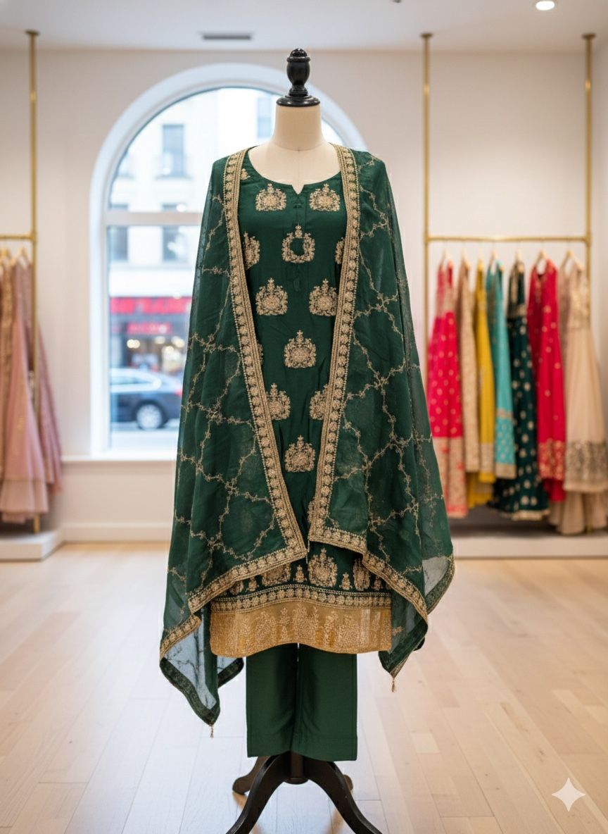 3 piece Pakistani women silk dress, very generous green shade with golden embroidered silk dupatta full embroidered & silk trouser with lawn inner Shirt length 40, chest 21, sleeve 18 It’s a little design defect on right under arm, no idea how this happened it’s not ripped but little messy hardly noticeable Selling very low price, Only shipping please