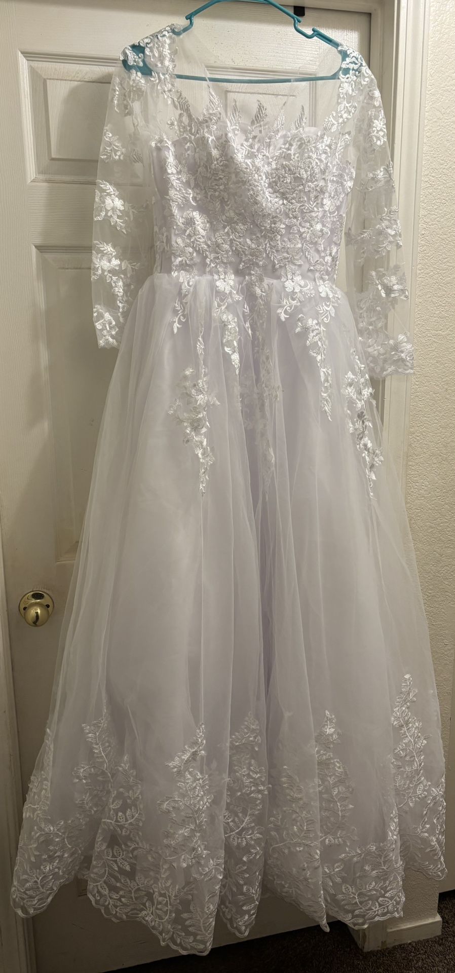 Never worn I believe it’s a size 9 medium. Corset back to adjust. All white