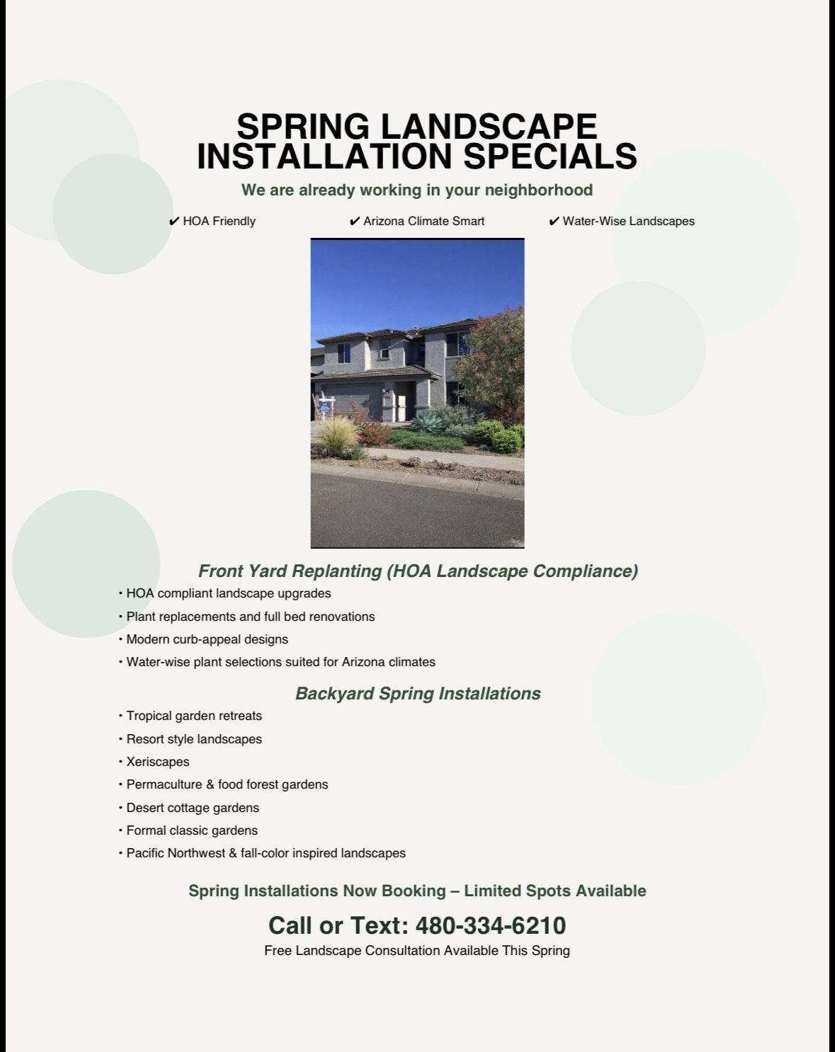 ๐ฟ SPRING LANDSCAPE INSTALLATION SPECIALS ๐ฟ Transform Your Outdoor Space This Spring Whether you want to refresh your front yard to meet HOA standards or create a dream backyard retreat, we design and install landscapes tailored to your vision. โธป Front Yard Replanting โ HOA-compliant landscape upgrades โ Plant replacements & full bed renovations โ Modern curb appeal designs โ Water-wise plant selections for Arizona โธป Backyard Spring Installations Create the landscape youโve always wanted: ๐ด Tropical garden retreats ๐ Beach resort-style landscapes ๐ต Low-water xeriscapes ๐ณ Permaculture & food forest gardens ๐ธ Desert cottage gardens ๐ Formal classic gardens ๐ Pacific Northwest & fall-color inspired landscapes If you can imagine it, we can build it. โธป ๐ฑ Spring Installations Booking Now ๐ Call or Text: (contact info removed) Free Consultation Available