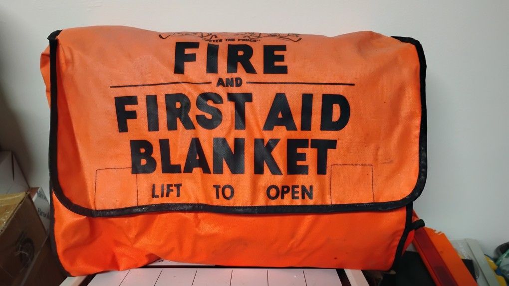 Vintage "Peter The Pouch" Emergency Fire And First Aid Blanket. All original blanket and pouch. Orange high visibility waterproof nylon pouch with strong but easy release Velcro ties is in good condition. No damage except for small areas of discoloration. The grey wool blanket is in very good condition with no damage, odor or stains. Perfect for emergencies and as a part of any retro emergency artifacts. Emergency Fire and First Aid Blanket Kits These kits typically include a fire-retardant wool-blend blanket stored in a high-visibility red or orange bag that can be mounted to a wall for quick release during a crisis. Fire & First Aid Emergency Blanket With Fyr-Glo Pouch Pouch Details: Features a fluorescent orange "Fyr-Glo" vinyl-coated nylon pouch that is flame retardant, waterproof, and resistant to grease and chemicals. It includes two grommets for wall hanging and a heavy-duty carrying handle. Blanket Specs: The blanket is a 62" x 80" gray wool blend (70% wool, 30% synthetic) designed to smother clothing fires or keep shock victims warm.