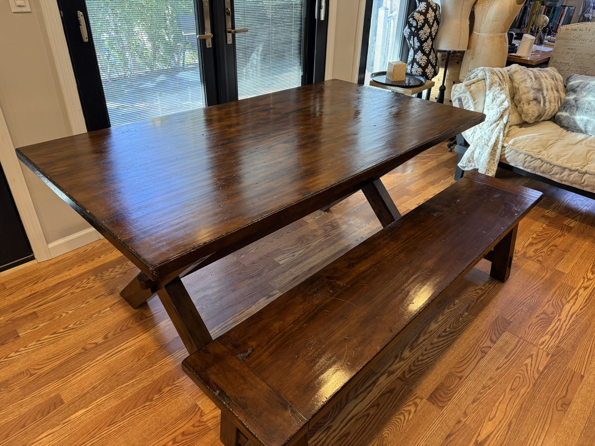Pottery Barn Dining table 70” x 38” solid wood Bench 70” x 14” Bench cushion