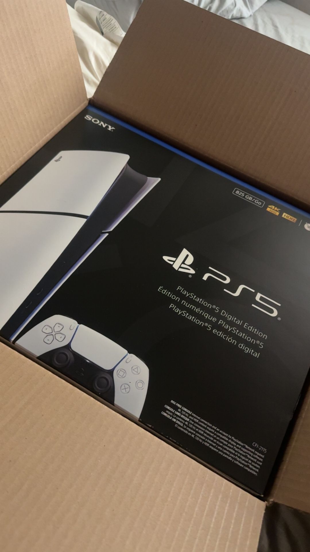 Selling brand new never before opened 825 Gbs Digital Ps5 slim. Everything included such as original controller , all original cables, all original hardware that normally comes in a brand new ps5 box basically.