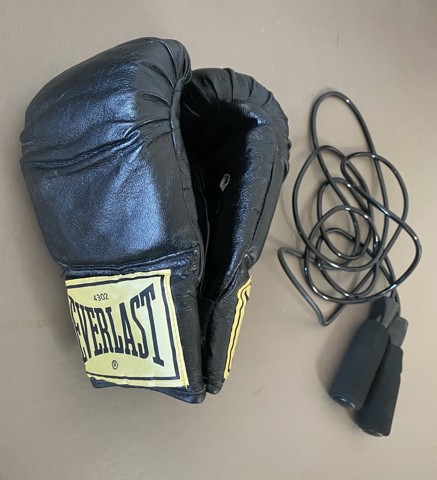 FIRM ON PRICE. Pairing of EVERLAST heavy bag/speed bag gloves #4302. Adult length, weighted cable jump rope with foam padded grips. Boxing workout, both in excellent condition, hardly used. Selling for more online, From clean, pet and smoke free home.