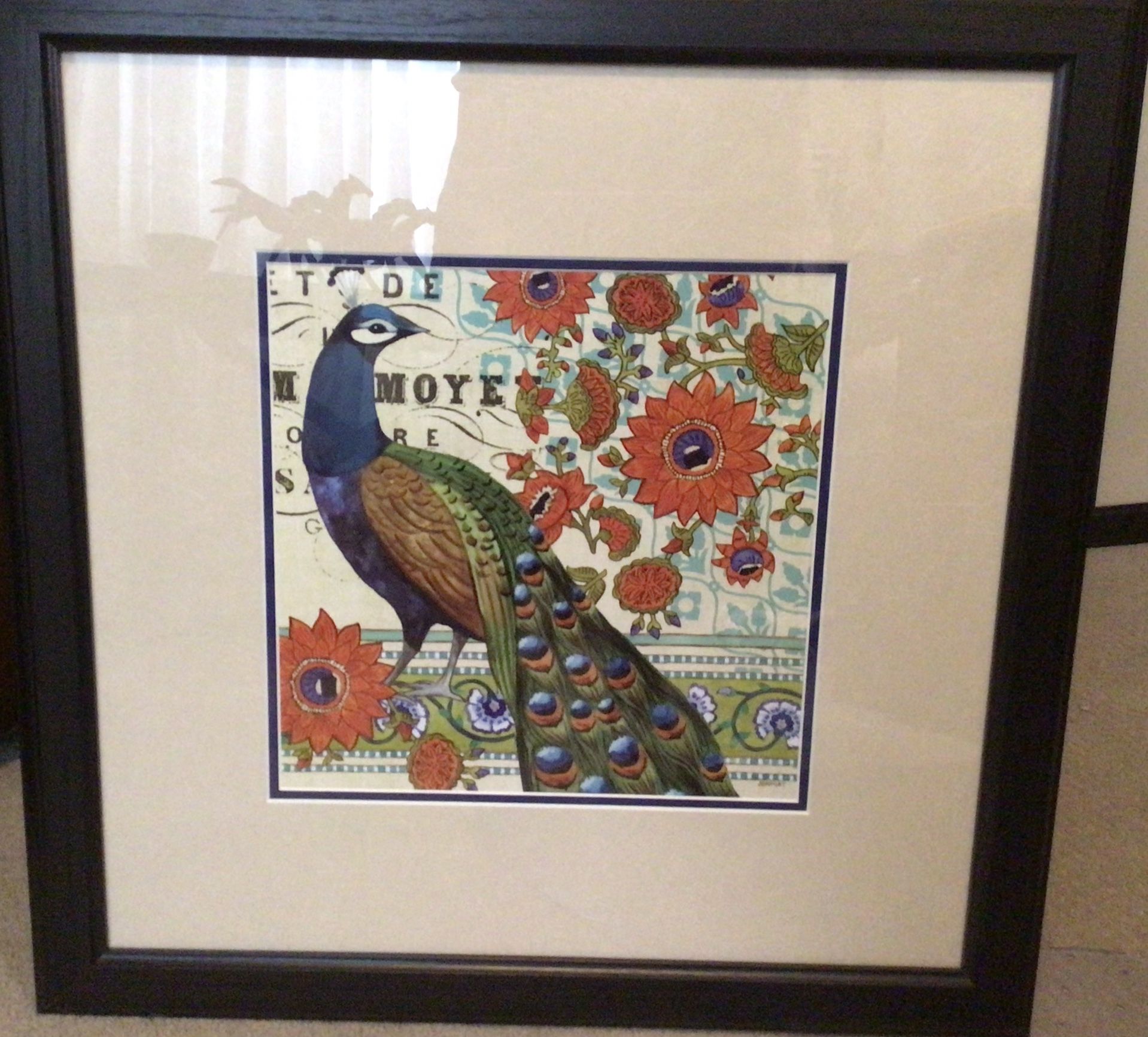 2 Beautiful Peacock prints Beautifully Framed And Matted. Large 23” X 23”. Colors Of Burnt Orange And Sold As A Set. $45 Each. Less Than Frame Cost.