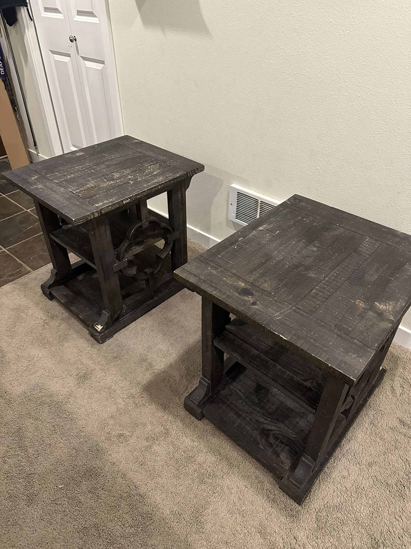 Giving our living room a refresh and parting ways with this beautiful matching coffee table and side tables set – a perfect addition to any cozy or modern space! Originally purchased just a couple of years ago, these pieces are both functional and stylish. The coffee table features a convenient lift-top (great for working, eating, or just kicking back), and the matching side tables bring a cohesive look to any room. Hard wood so they’re slightly heavy. Measurements: Lift-top coffee table: 50”L x 30”W x 18”H Side tables (2): 24”L x 20”W x 24”H Condition: Used the wood could definitely be re-stained Some puppy nibble on the bottom corners A quarter-sized pink paint stain on the lift-top corner See photos for details – happy to send more if you're interested! $50 OBO. Message me with any questions! Thanks for checking it out!