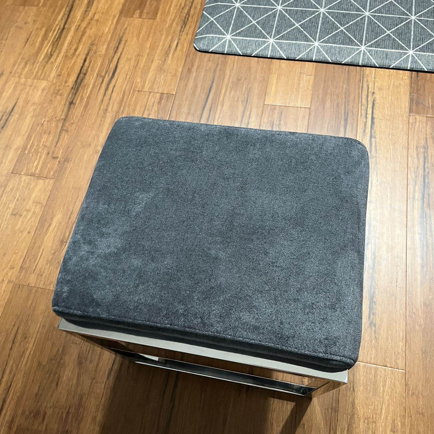 For sale in excellent condition a Grey Ottoman Seat Chair Fabric Stainless Steel- Chrome plating Unbranded Retails Price at Walmart $201 Measurements 13”x16”x18” Small and light (seats 1 person)