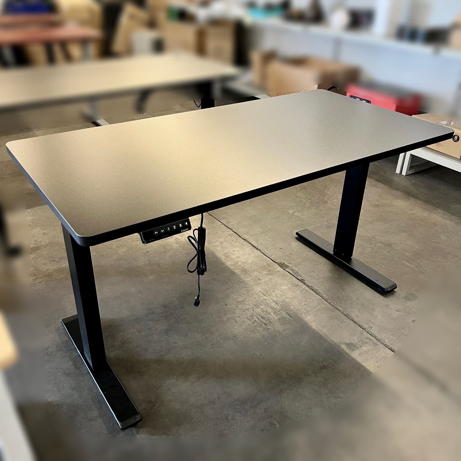 Dual Motor Electric Standing Desk with Memory Preset, One Piece Desktop, Table, Office Desk, Motorized Sit and Stand Up Desk, Electric Height Adjustable Desk, Computer Desk, Brand New Office Furniture, Ergonomic Desk, Sit Stand Desk, Work From Home, Black Desk ❗️BRAND NEW IN BOX, STILL SEALED ❗️PICK UP ONLY (10601 Oak Glen Ave, Montclair, CA 91763. Message for hours) ❗️Bulk Orders available! ❗️All parts needed for assembly are in the box, including instructions and tools SPECS 🔹Table top dimension: 55” x 28” 🔹Height adjustable from 24.6” to 50.2” 🔹Weight capacity: 220 lbs OTHER INFO 🔹Brand: ErgoArt / Flexispot 🔹Model: L-3S2M-B 🔹Leg frame: Dual Motor 🔹Table top material: Chipboard / laminated wood DESK COMES IN 2 BOXES Table Top Box 🔹Weight: 45 lbs 🔹Dimension: 59” x 30.5” x 2.25” Leg Frame Box 🔹Weight: 56.2 lbs 🔹Dimension: 33.5” x 14” x 6