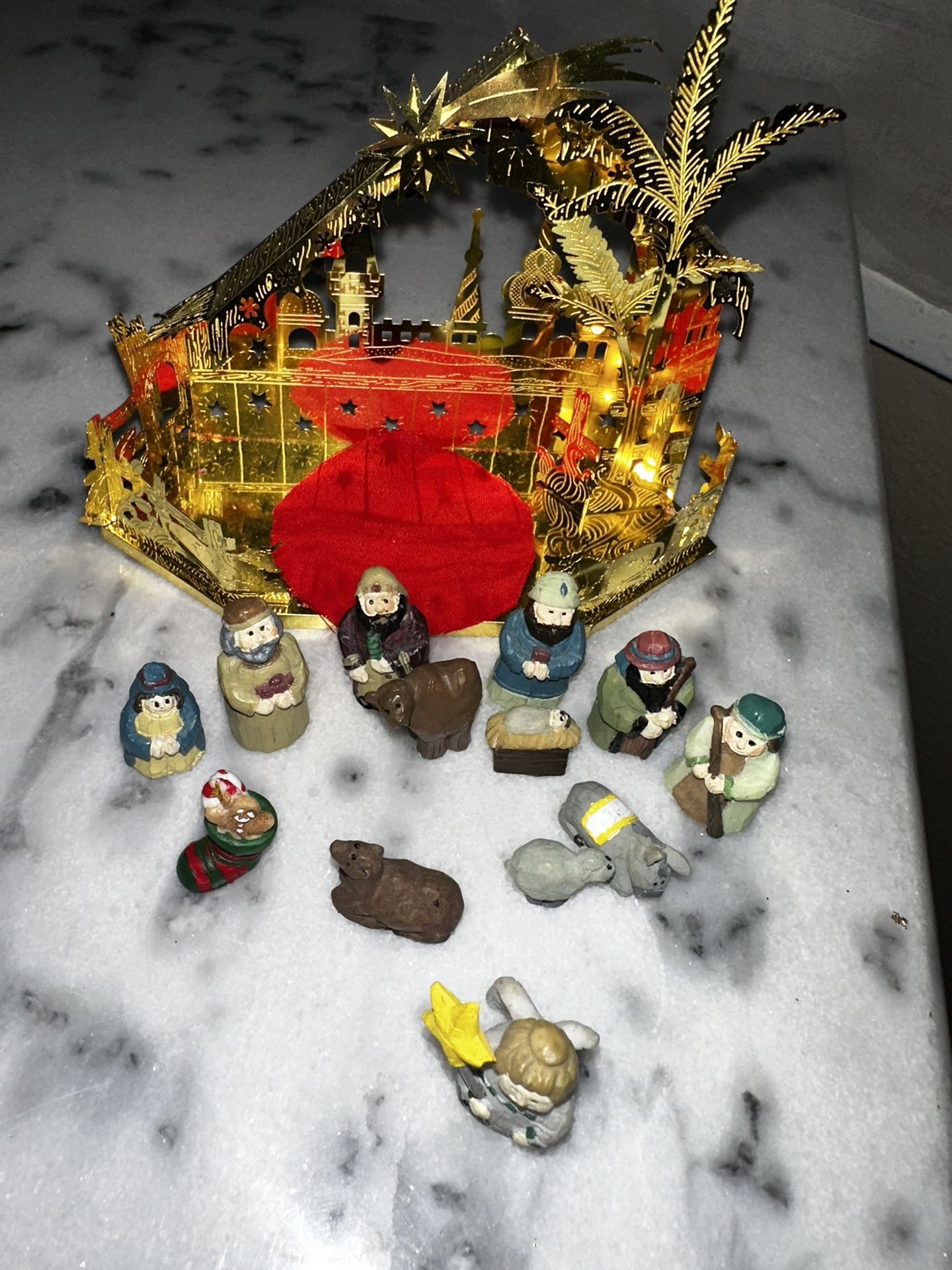 Miniature Nativity Set With Gold Metal House