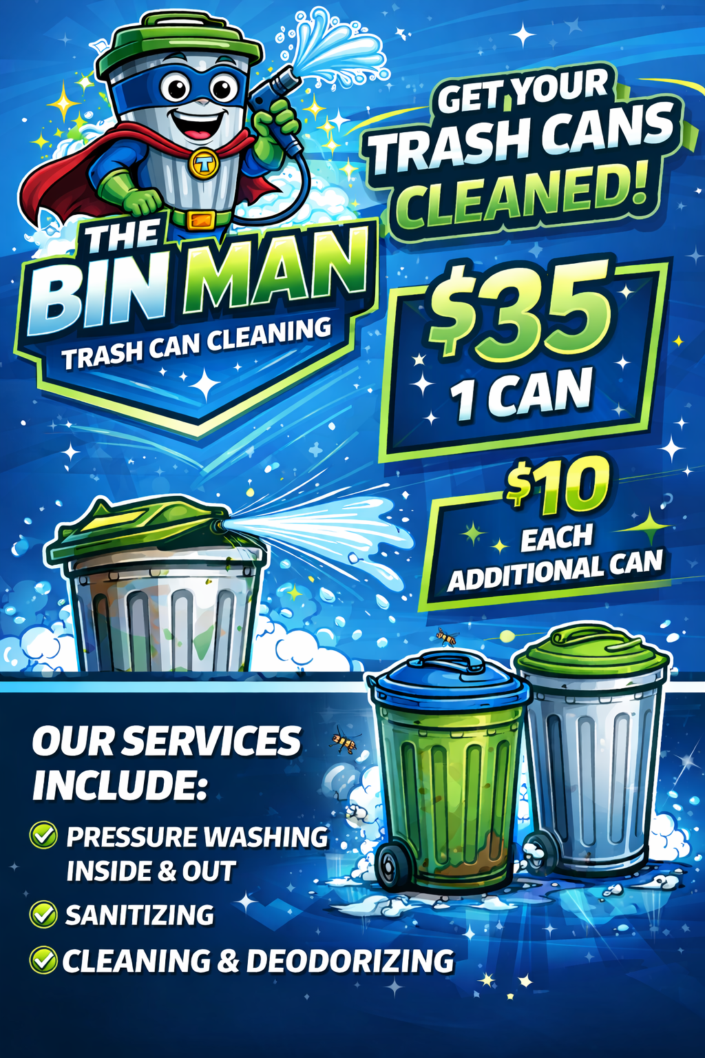 Keep your trash cans CLEAN, SANITIZED, and ODOR-FREE! ✔ Deep cleaned inside & out ✔ Pressure washed ✔ Sanitized ✔ Deodorized $35 for 1 can $10 each additional can Message for availability 👍