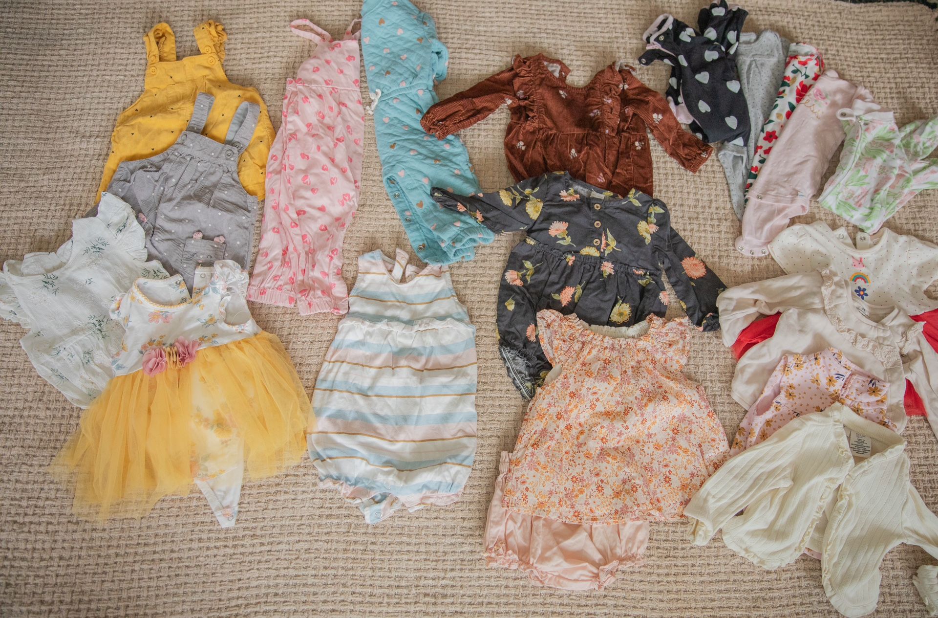 6-9 month baby girl clothing, romper, dresses, footed pajamas, onesie At least 9 pieces new, never worn