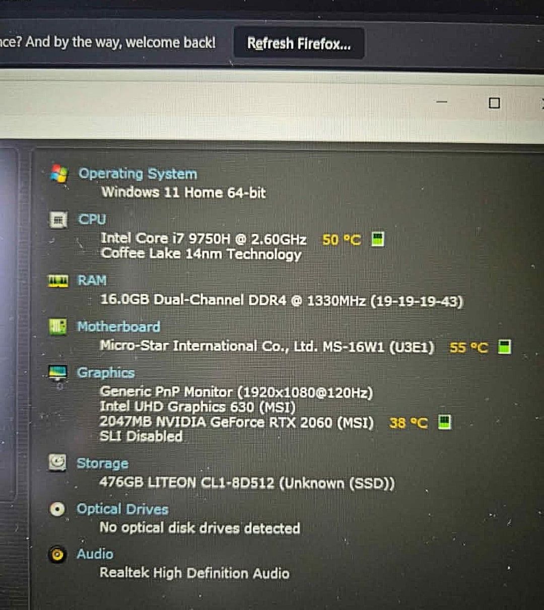 Price: $450 (Willing to negotiate) Condition: Used – works perfectly Included: Laptop + charger Specs • 15.6” FHD 120Hz display • Intel Core i7-9750H • NVIDIA GeForce RTX 2060 • 16GB RAM • 512 GB NVMe SSD (original drive) • Windows 11 Highlights • Smooth 1080p gaming • 120Hz screen for fluid gameplay • Thin, powerful RTX 2060 gaming laptop Battery & Performance Notes • 🔋 Strong battery health (~90.8% original capacity remaining) • Fan gets loud at max performance (normal for thin gaming laptops) • Best performance when plugged in.