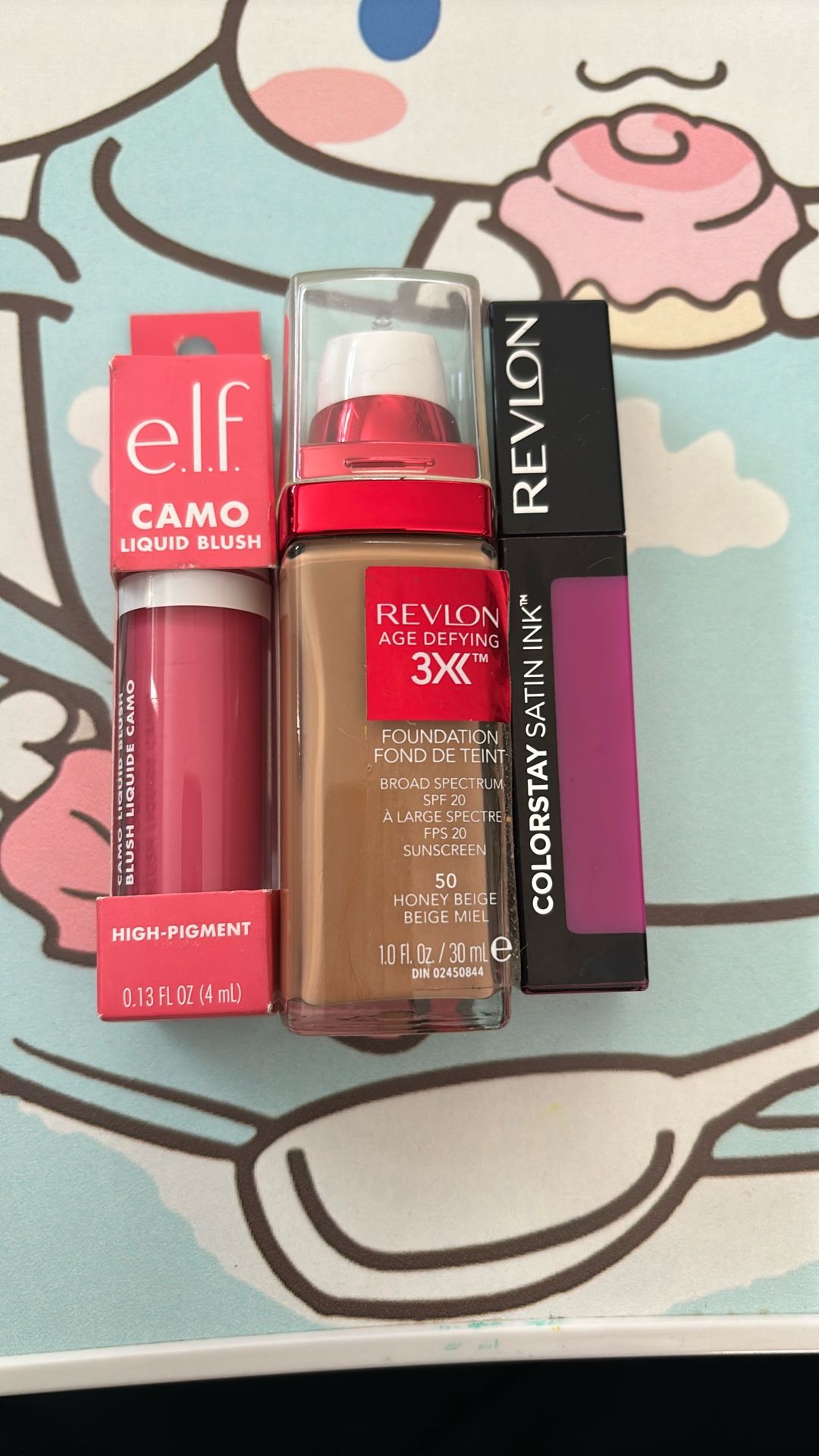 Camo high-pigment liquid blush, Revlon age defying foundation (honey beige) and Revlon color stay satin ink lipstick