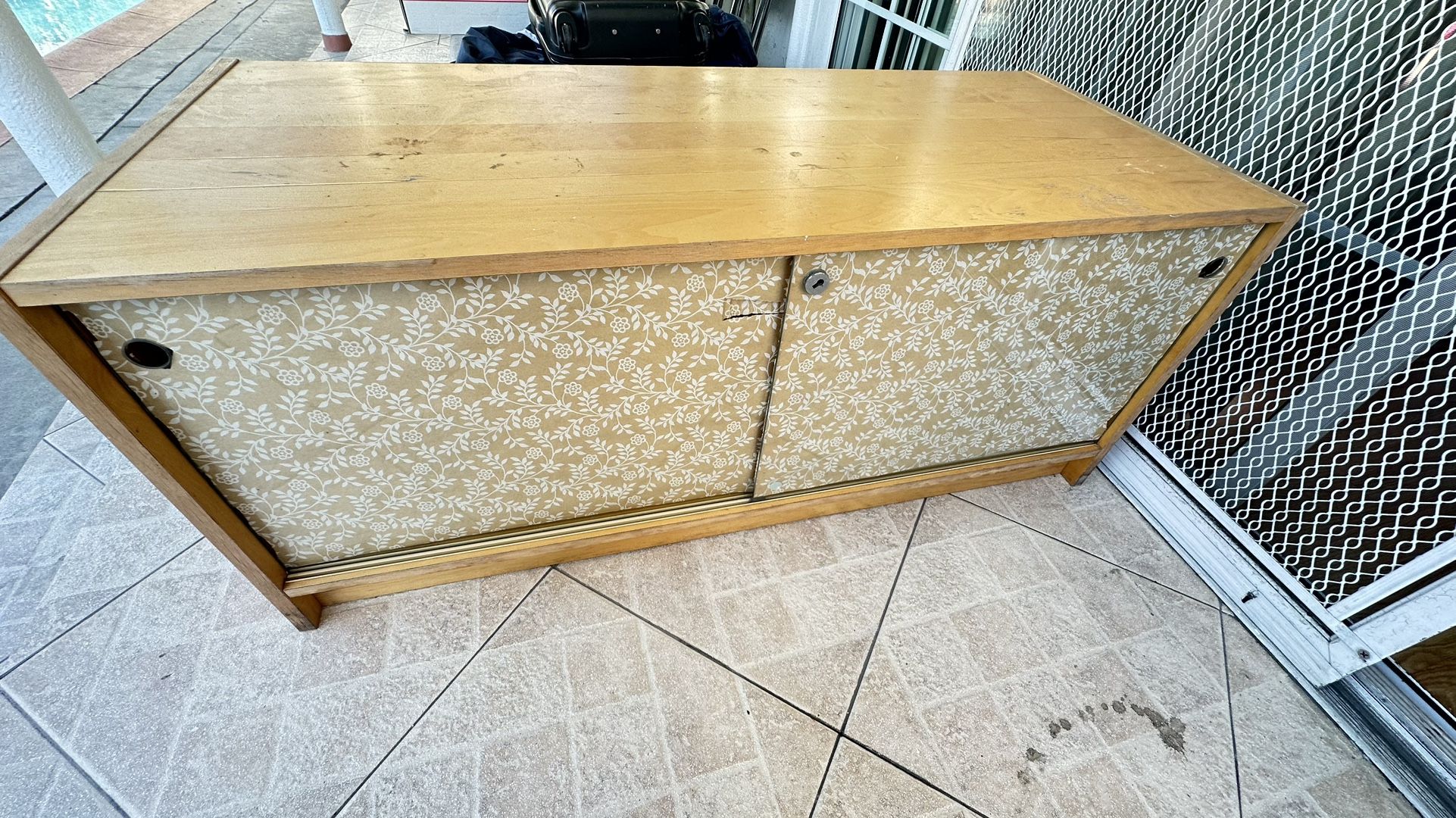 Description: I sell wooden furniture in good condition, very functional and with unique design in the doors. Ideal to use as an entertainment center, credenza or for storage anywhere in the house. • Measurements: 46" Long x 19.5" Width x 19.5" High. • Features: Sliding doors with floral design and interior space with shelf. • Condition: Used, with normal details of use but solid and stable. Pick up at [Your location/City]. Delivery does not include.