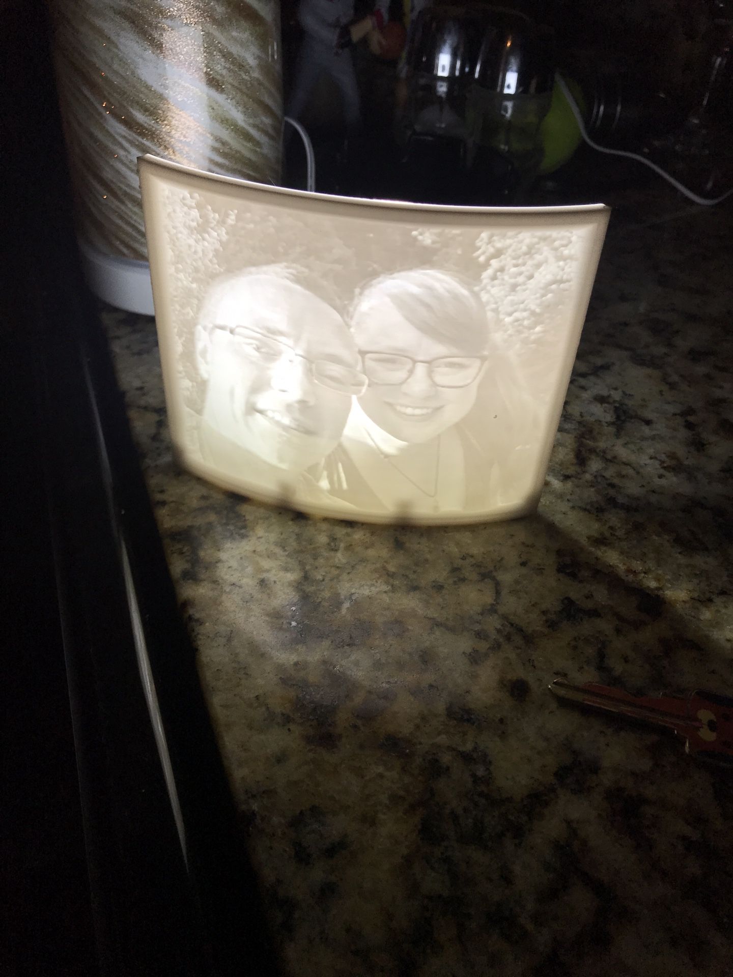 The photo/photos are there just to show/ model what one looks like. The lithophane comes with the circular touch light and stand in the back It measures 5“Lx 4“H but each one is completely customizable. We Can make these much larger, smaller to fit a nightlight plug in the wall, different shapes, exc. If you are interested please message me and I can Let you know a ballpark figure of what it would cost. For one like what I seen in the photos you could expect to spend anywhere from $35-$50 just depending on the thickness and shading. Reach out with questions, thanks for looking!