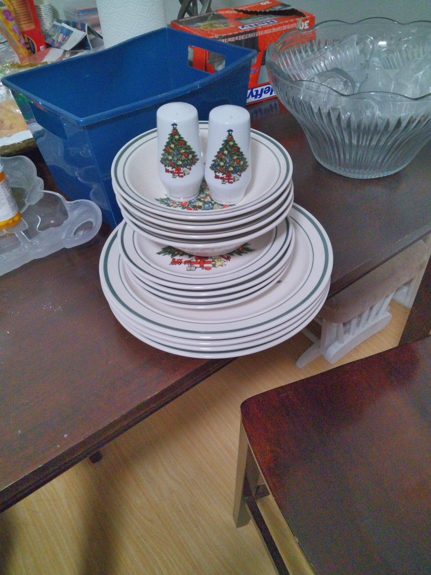 4 large plates 4 small plates with 4 bowls and salt and pepper shakers Xmas decor good condition so 14 piece in all