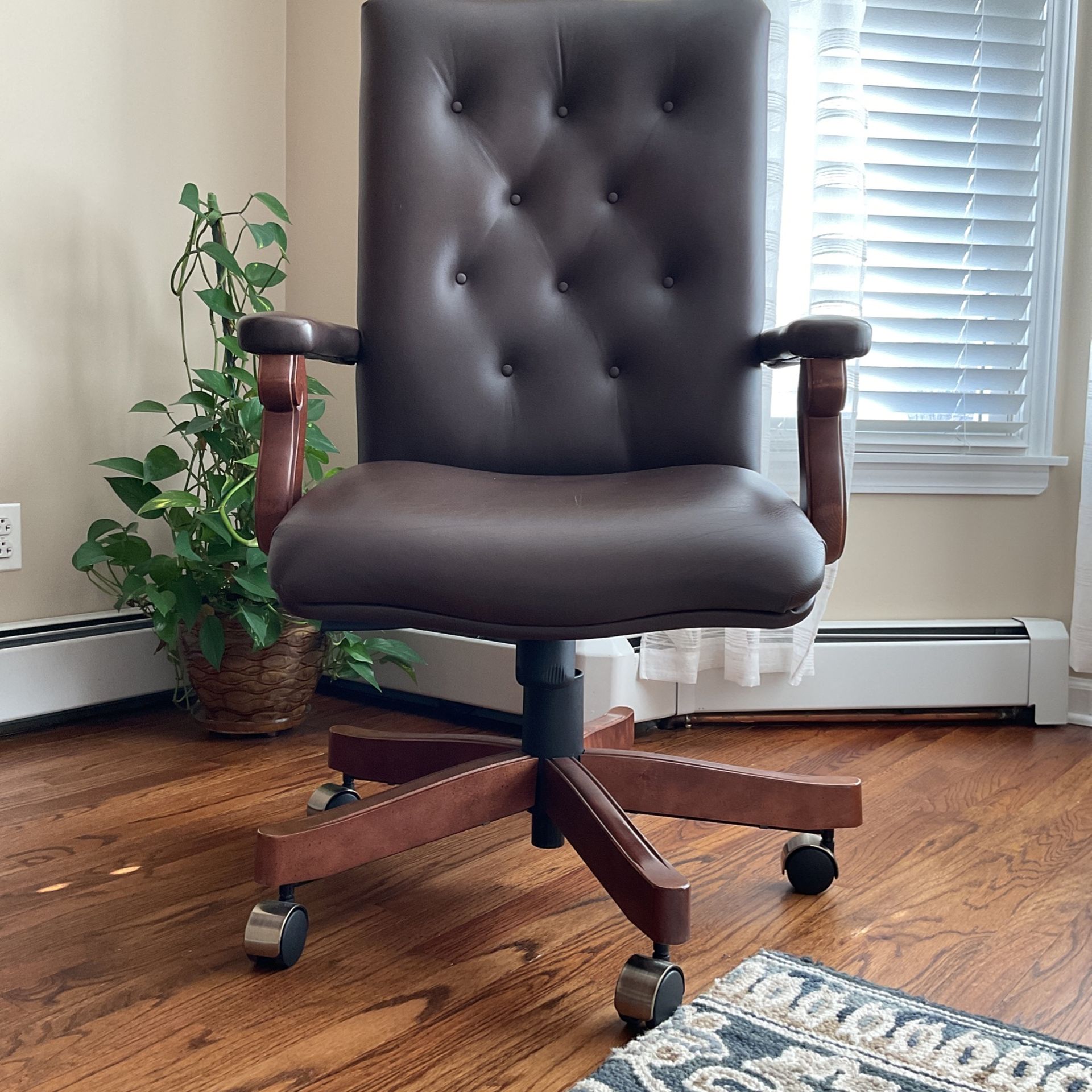 Stanley Furniture brown leather office chair Swivel and height adjustable Wood base with wheels