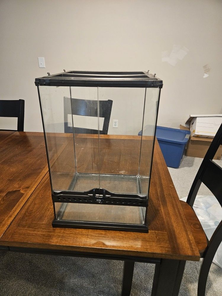 Exo Terra Glass Terrarium Natural Terrarium Mini Tall Dimensions (WxDxH) 12 X 12 X 18" 30 X 30 X 45 cm Small damage on top mesh. Some of the hard plastic has warped slightly from a heat lamp.