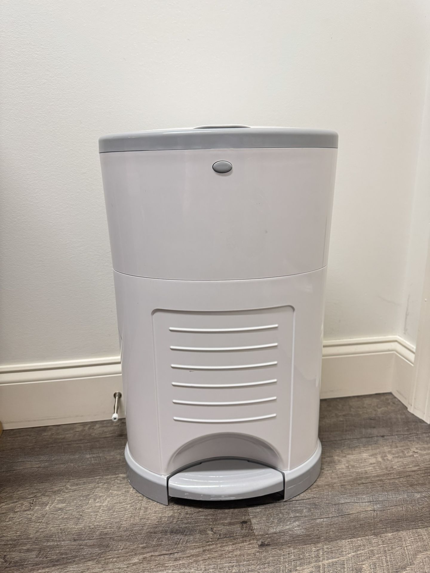 Durable, Easy-to-Clean Construction: Crafted w/ABS plastic that’s built to last and won’t absorb odors. Unlike metal pails that can rust, this surface can be safely cleaned and sanitized with common household cleaners. Spring loaded trap door quickly lets the diaper through and instantly closes to contain odors in the pail. Empty the pail as often as you want without wasting a full trash bag. The continuous liner system lets you cut and tie off exactly what you need. -Child proof lock -Self Closing whisper lid -Continuous liner system -Foot pedal -Comes with one pack of liners Great condition! Just one scuff mark on the side (see photo).