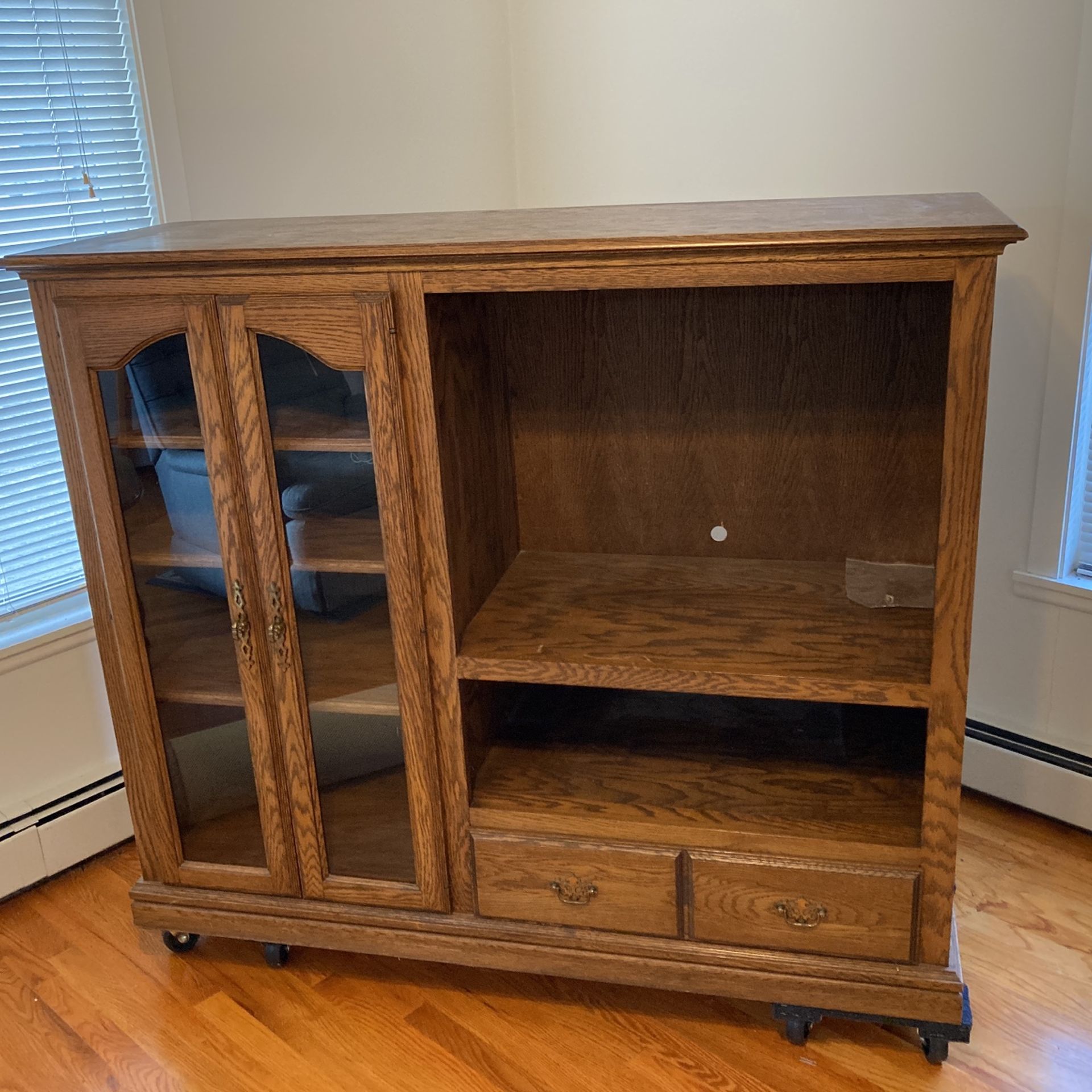 Oak entertainment center. Will hold 32” flatscreen tv and other components 58” wide. X. 48” wide X 20” deep