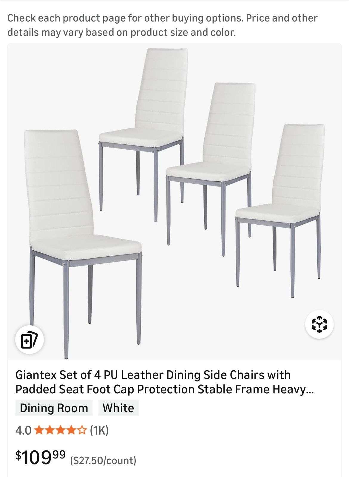 Giantex Set of 4 PU Leather Dining Side Chairs with Padded Seat Foot Cap Protection Stable Frame Heavy Duty High Back Design Dining Chairs for Kitchen Dining Room Home Furniture, White One of the chairs has a little tear in the fabric New open box . I have lower the price .