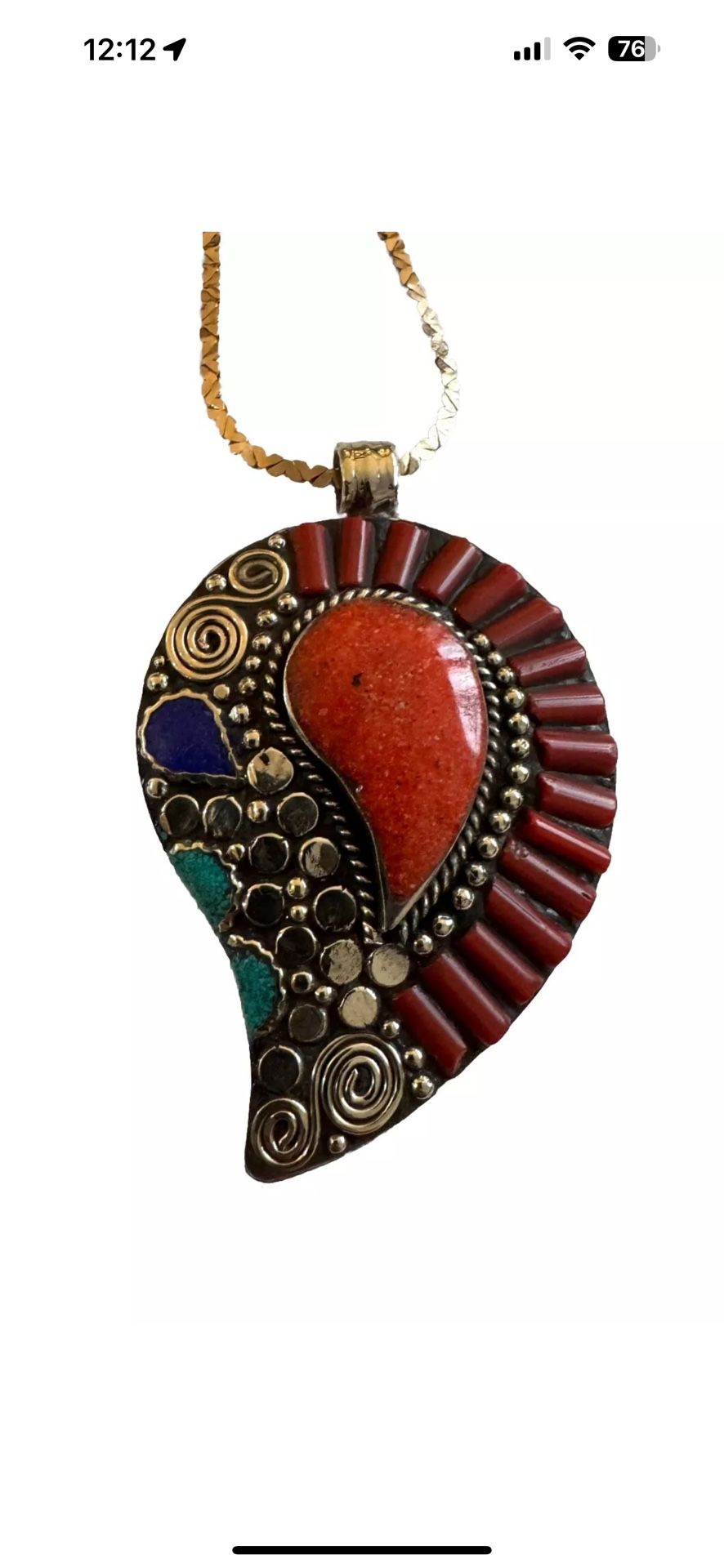 This Unique and stunning handcrafted tribal theme & Navajo style pendant is a stunning piece of Tibetan jewelry,handcrafted entirely by skilled artisans from himalyan region Nepal.This intricate design features rhombus shape with inlay coral stones set in Tibetan silver show casing the unique and beautiful culture of Tibet and Nepal. This Pendant size 3”inch tall and weighs 41grams. Great piece for gift and collection of Tibetan tribal theme pendant from himlayan region Nepal( Note) if you have any issue with this purchase ple message me before leaving a negative review.I will try my best to solve it.Thanks and happy shopping 🙏