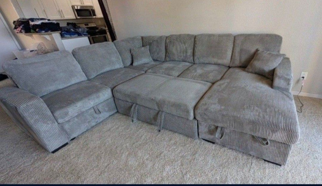 4 pc Black corduroy fabric sectional sofa with storage chaise and love seat and pop up sleep area in center USB charging. Sectional features a pull out sleep area in center and storage in chaise and love seat, with USB charging on side . Sectional measures 120" x 92" x 60" L chaise x 36" H. Some assembly may be required✅️✅️$698+ sale tax $770 total ,cash only, this promotion is just pick up only Delivery is not available ✅️ ✅️ grey color only at this price,everything is brand new in the box,📦 assembly required✅️✅️✅️