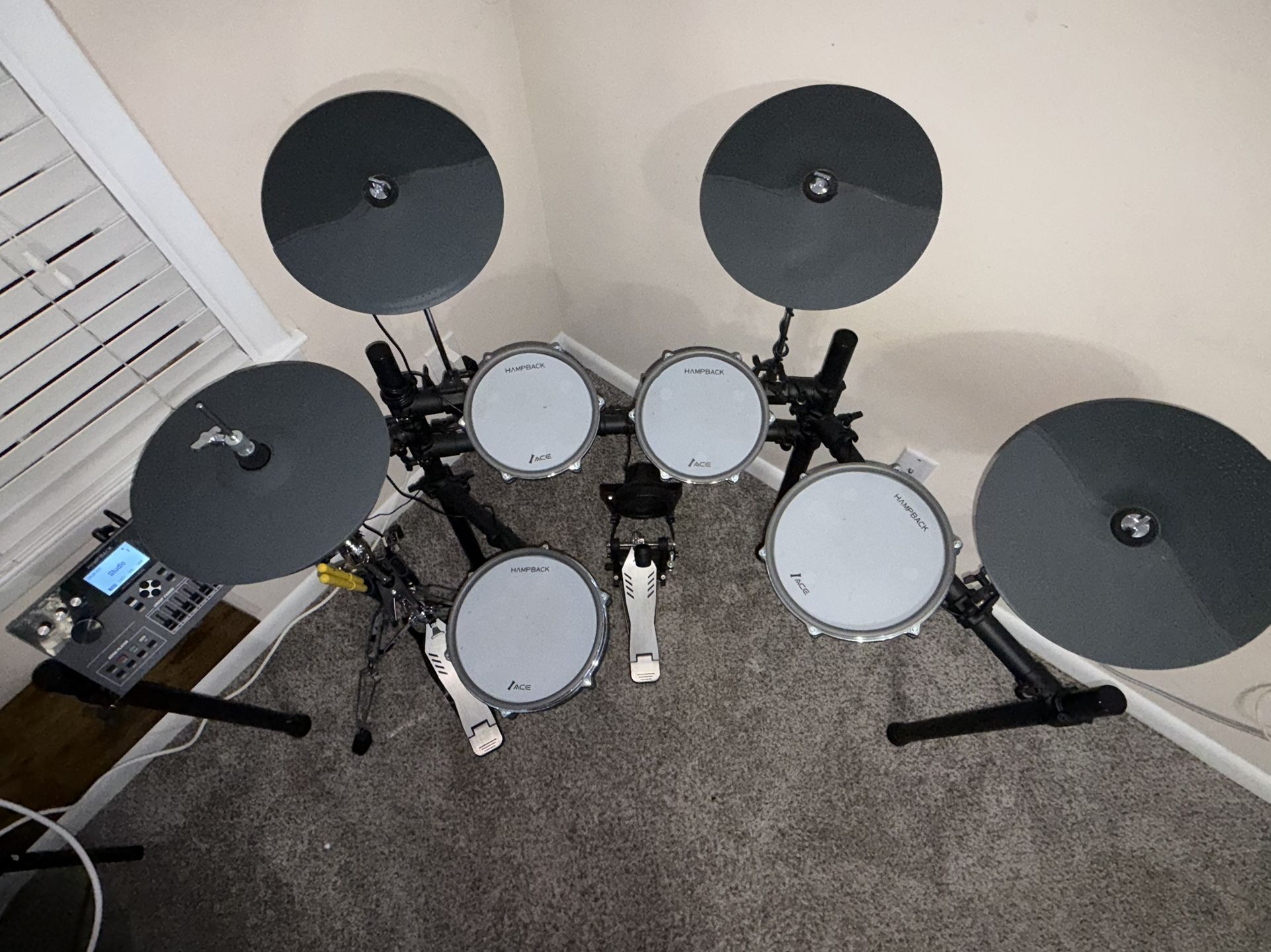 Electronic Drum Set Really good condition Works perfect Headphones/Audio system is necessary to play Selling because I need the space Includes: 1 (12" Hi-Hat) <- (Independent) 3 (12" Cymbals) 1 (10" Snare) 1 (10" Tom) 2 (8" Toms) 1 Pair of Zildjian Sticks + Holder (Used) 1 Drum Key - Bluetooth Capability -Rimshots -Cymbals with choke -Working Hi-hat (Opens/Closes with pedal) - Customizable Kits -Easy Build/Deconstruct with wingnut clamps If you want I can have it ready to test Send a message for any questions you have Pickup preffered (Chamblee Area) (Cash or Zelle)