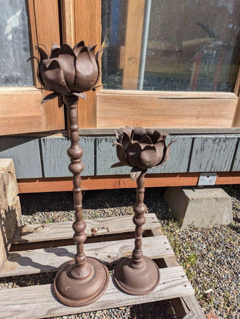 Stunning Vintage Tall Metal Lotus Flower Candle Holder MCM Floor Set. 27" approx 20" approx These are beautiful and in good condition, just don't match my decor.
