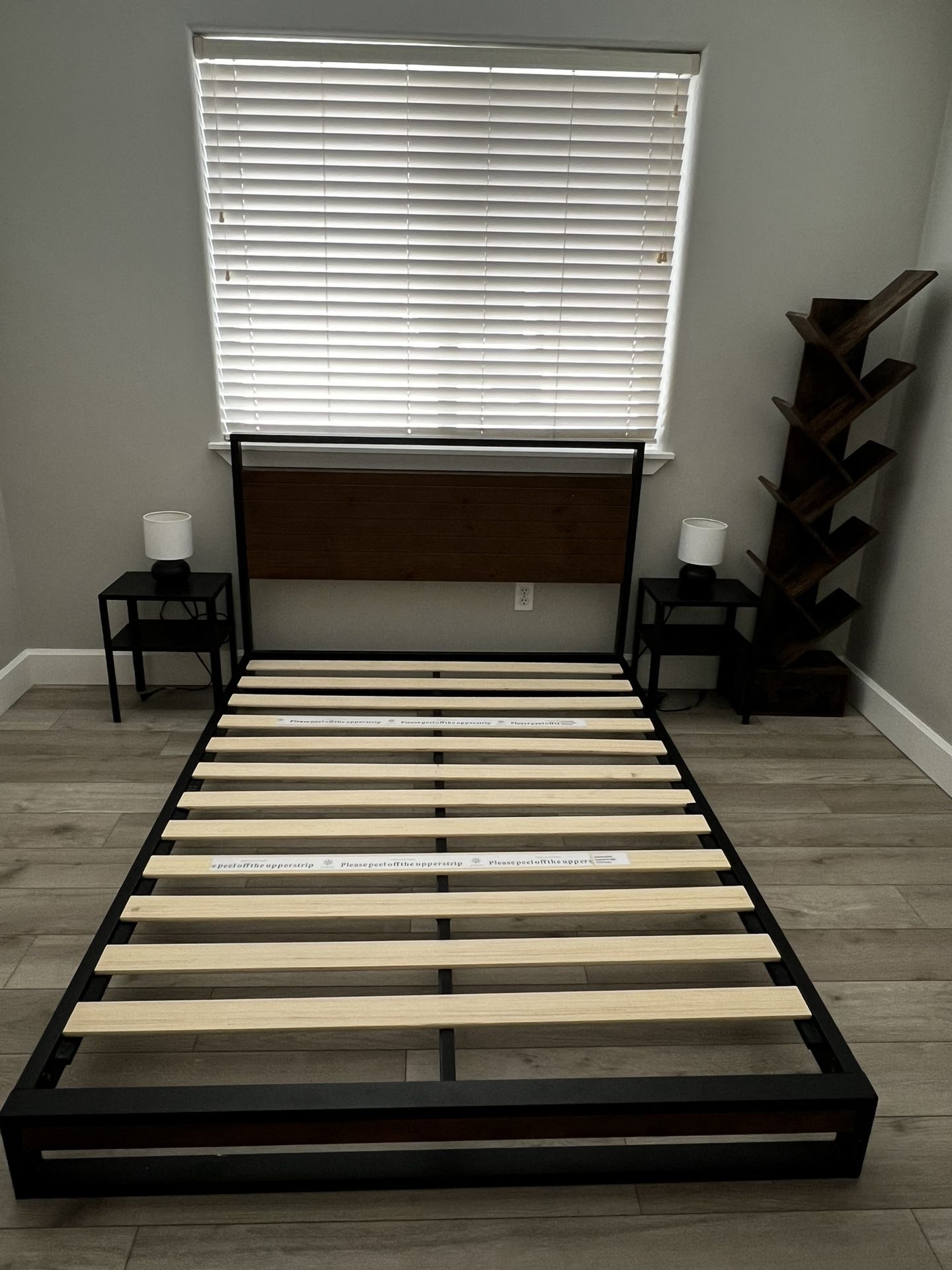 Mid-century inspired bed frame made of real bamboo and matte black metal. Low profile and sturdy. Retails for $310
