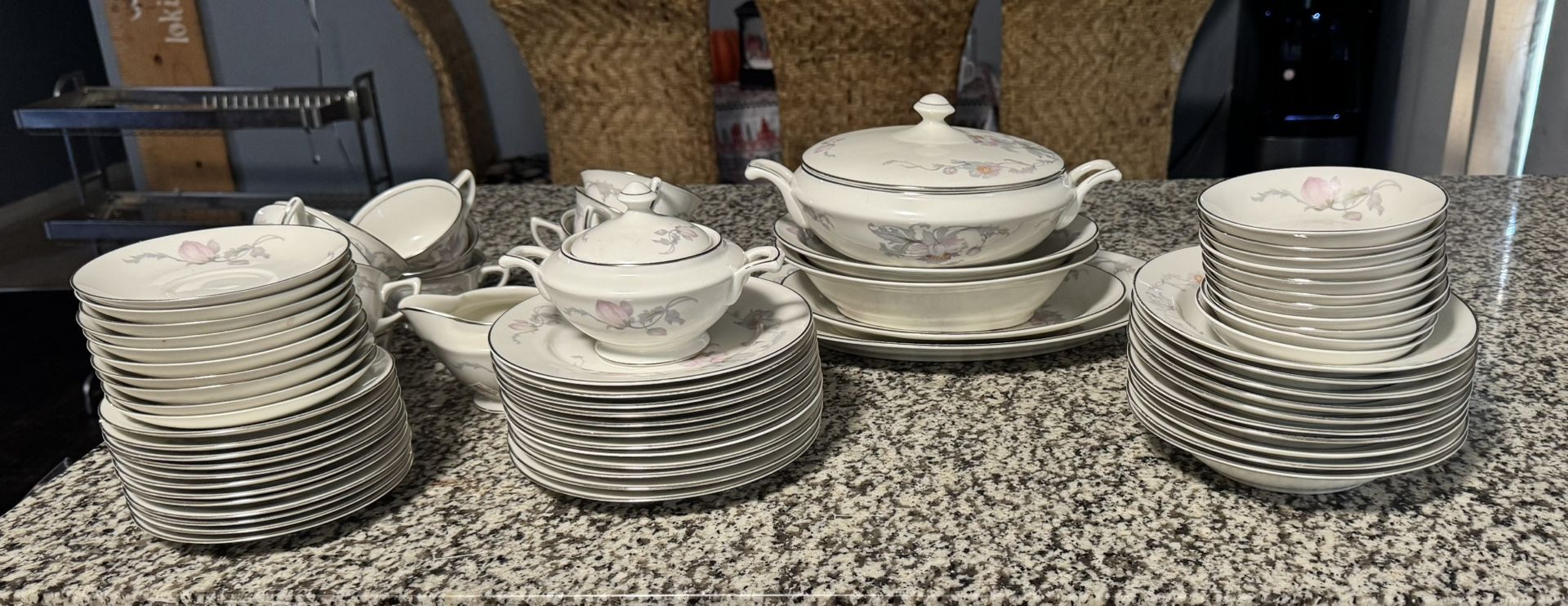 Complete Silver Poppy collection: dishes, cups, plates, and more — gently used and ready for a new home.