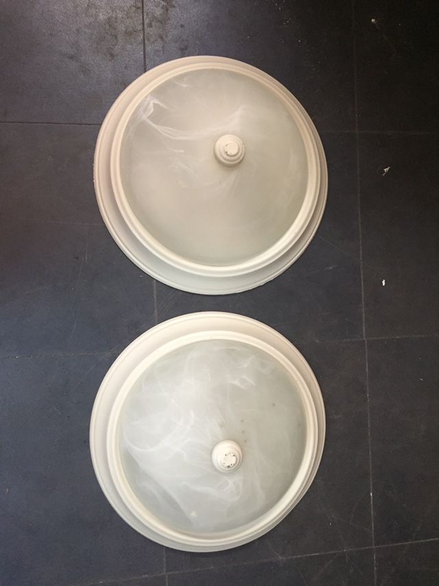 This is a pair of ceiling lights. They are in good condition with no cracks in the glass shades. There are some scuffs on the white part that screws the shade to the light. It can take 1 or 2 bulbs. Dimensions: Outer edge 13” diameter Shade edge 10” diameter Drop from ceiling approx 5”
