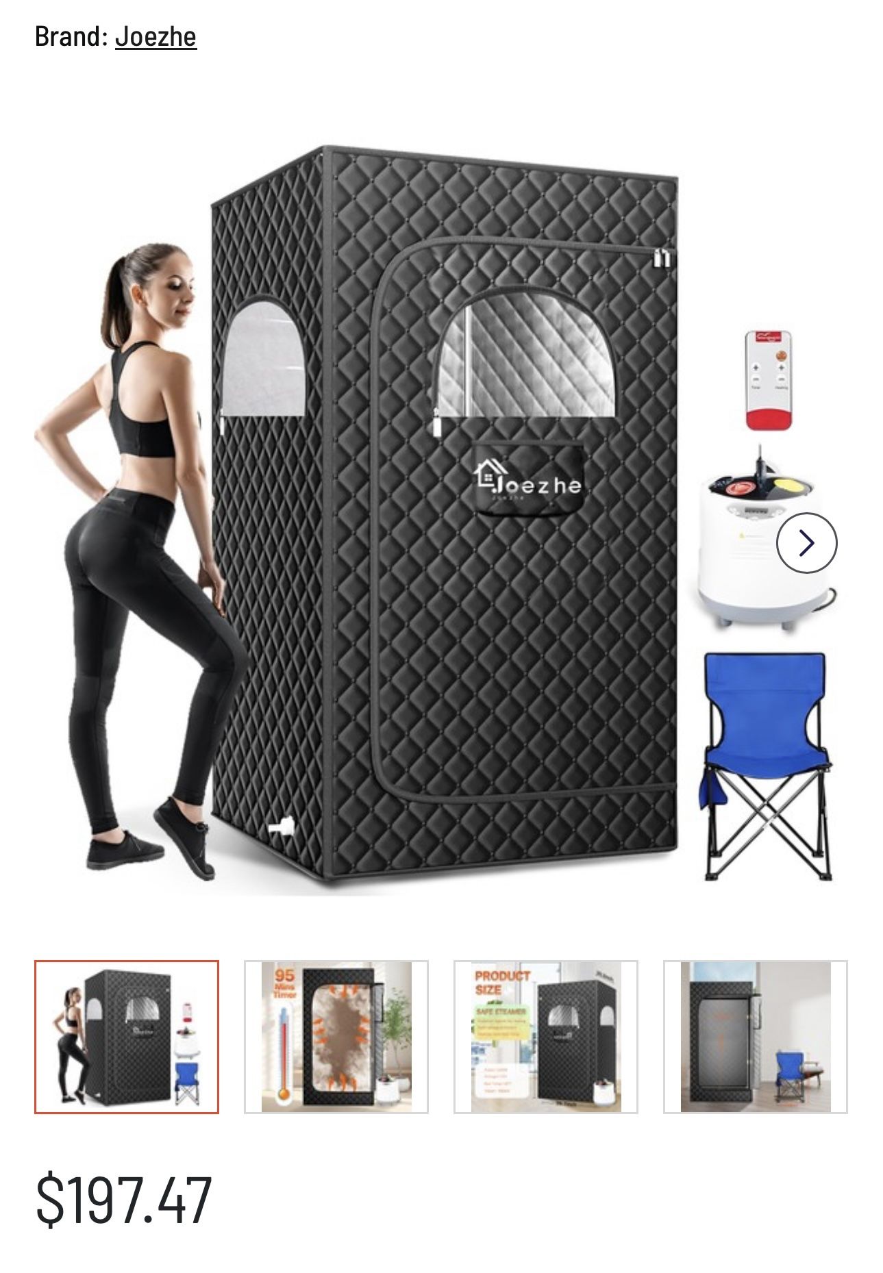 Joezhe Sauna Box,Portable Steam Sauna - Brand new Pick up by appointment 9am-5pm in Chandler Az Joezhe Sauna Box,Portable Steam Sauna Tent for Home,Personal Sauna Room with Remove Control,at Home Sauna Full Body,1200W 3L, for Women Compact and Easy Assembly: The Portable Steam Sauna Box is designed for hassle-free assembly and disassembly, featuring a rectangular frame with a cover made of Oxford Cloth, Cotton, Polyester, and Waterproof Coating. The assembled dimensions are 39.7 inches (L) x 68.5 inches (H) x 30.3 inches (W). Efficient Steamer with Remote Control: This unit includes a 2.6-liter capacity steamer with a remote control, offering easy operation and precise management of the sauna experience. The steamer has nine settings, with the highest setting achieving temperatures between 104°F and 140°F. Quick Heating and High Humidity: The steamer heats up in about 10-15 minutes after adding cold water, ensuring the sauna is ready for use swiftly. It maintains a high humidity level of 99%, delivering an effective and enjoyable steam sauna experience. Adjustable Timer for Custom Sessions: The initial timer is set to 45 minutes, with a maximum setting of 95 minutes, allowing users to tailor the duration of their sauna sessions to their liking. Regular use of the steam sauna can enhance skin health and boost overall well-being. Ultimate Relaxation Anywhere Experience spa-quality detoxification in minutes! Our portable steam sauna tent features a lightweight foldable design with 360° heat circulation technology. Unwind after workouts or long days while improving circulation - no bulky equipment or gym membership required. Rapid Heating & Smart Control Heating system reaches optimal 140°F in 8-10 minutes. Comes with digital timer (10-60min) and adjustable steam 9 levels. Overheat protection and auto-shoff ensure safe, customized sessions for all users. Detox & Revitalize Like a Pro Medical-grade PEVA fabric creates therapeutic infrared-like environment. Clinically proven to help flush toxins, relieve muscle/joint pain, and boost metabolism. Includes premium thermal blanket for enhanced sweating effect. Premium Quality, Zero Hassle Heavy-duty oxford cloth frame withstands daily use with waterproof floor mat. Collapses to 18" travel size (fits in car trunk/closet). Easy-clean interior wipes down in seconds - ideal for home, office or Airbnb. Complete Wellness Package Comes with ergonomic folding chair, 3L 1200w steam generator. Item# 1125