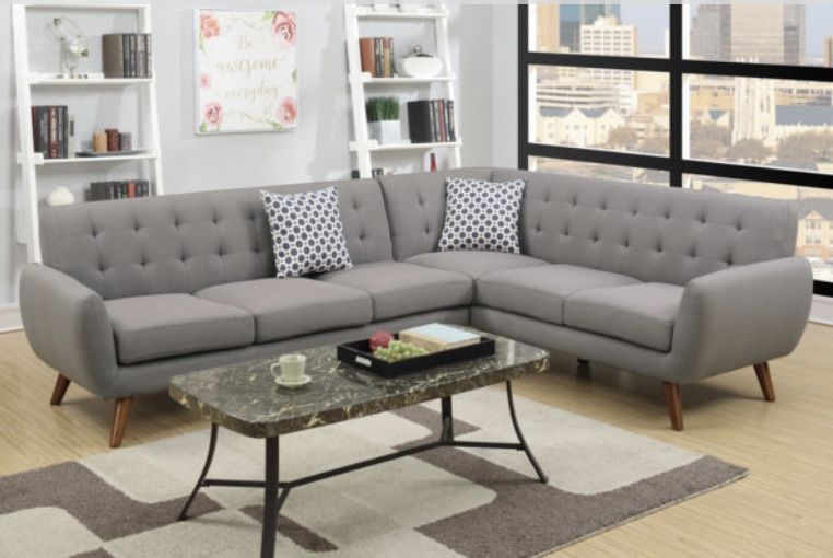 Sectional Sofa Item # F6961 Color: Grey Features: Accent Tufted Back Support Peg Leg Supports Available in Grey, Ash black & Laguna Also Available in Espresso Bonded Leather Some Assembly Required Materials: Polyfiber Pine Wood Wooden leg Dimensions: 111″ x 85″ *Chaise is Not Reversible