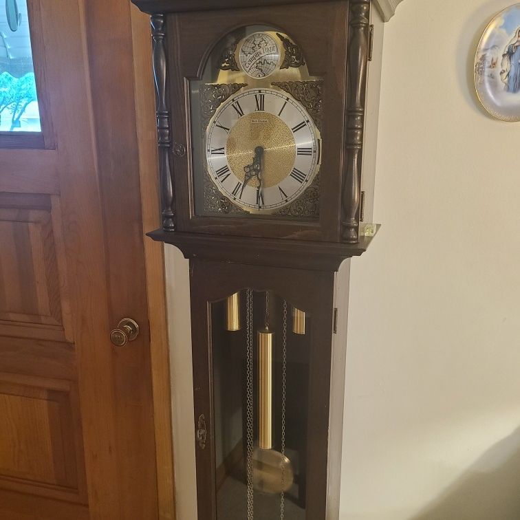 Beautiful Seth thomas grandfather clock chimes every 15 minutes and on the hour also u can shut it off if u want. Smoke free house. Must have way 2 pick up.