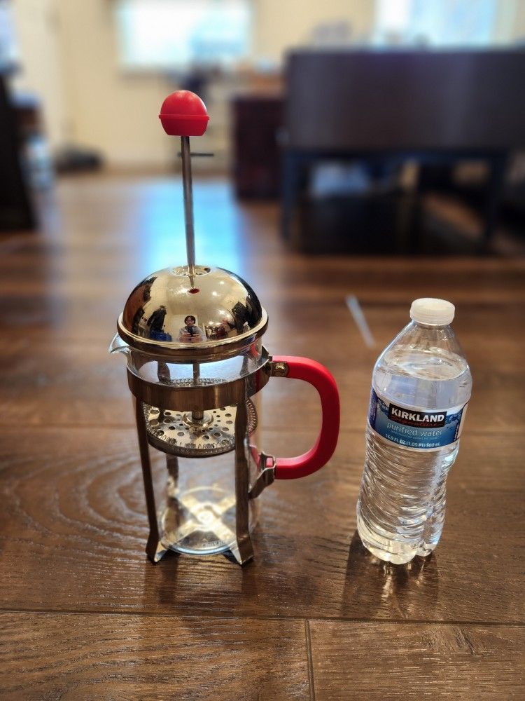 BonJour French press coffee maker, 34 oz (8-cup), Coffee Press Stainless Steel, Glass with Red Handle, good condition